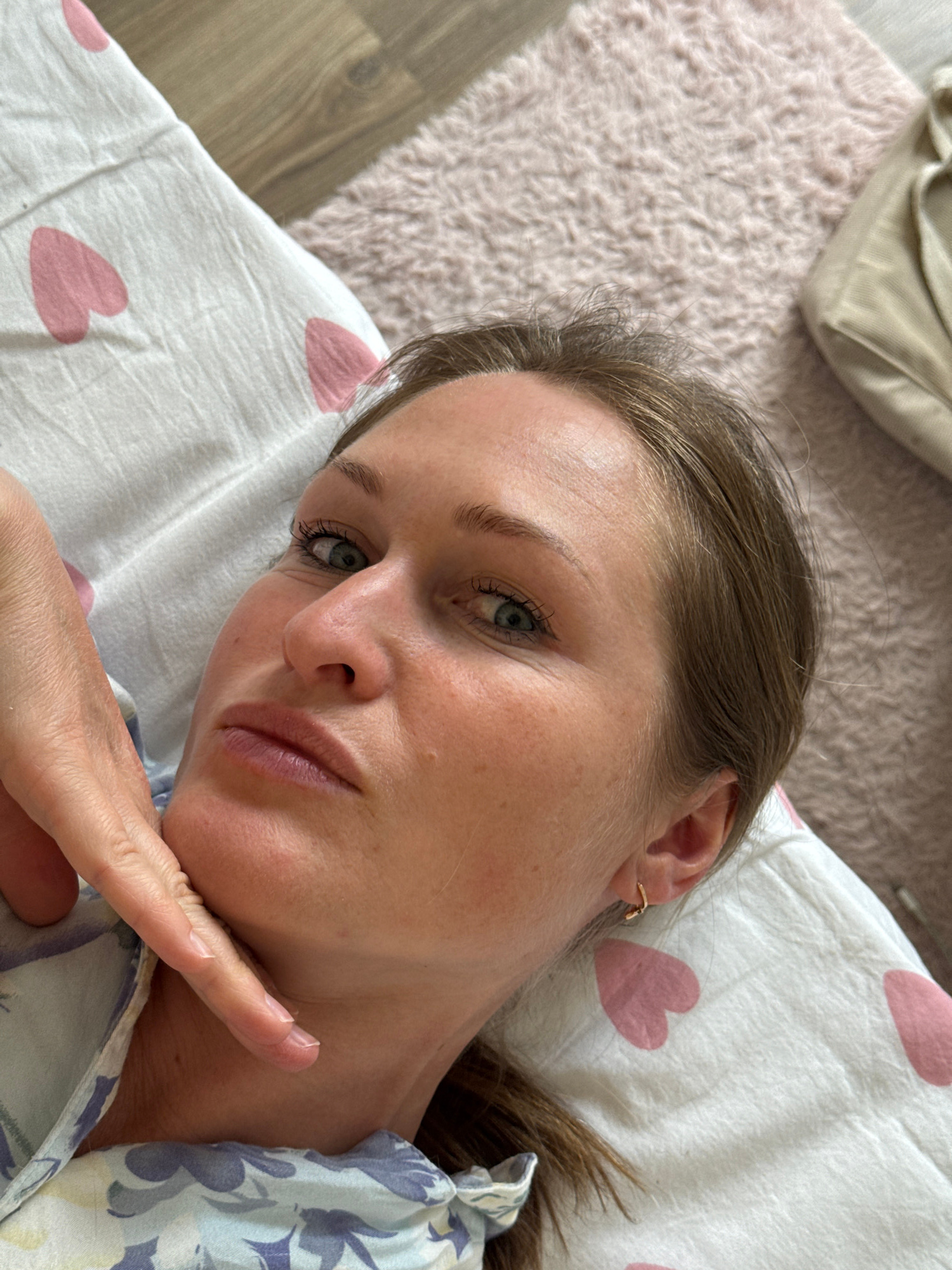 A close-up, slightly tilted shot captures a woman lying down indoors, likely in a bed or on a comfortable surface, in Chaikovsky, Russia. She is positioned on her right side, looking directly towards…read more