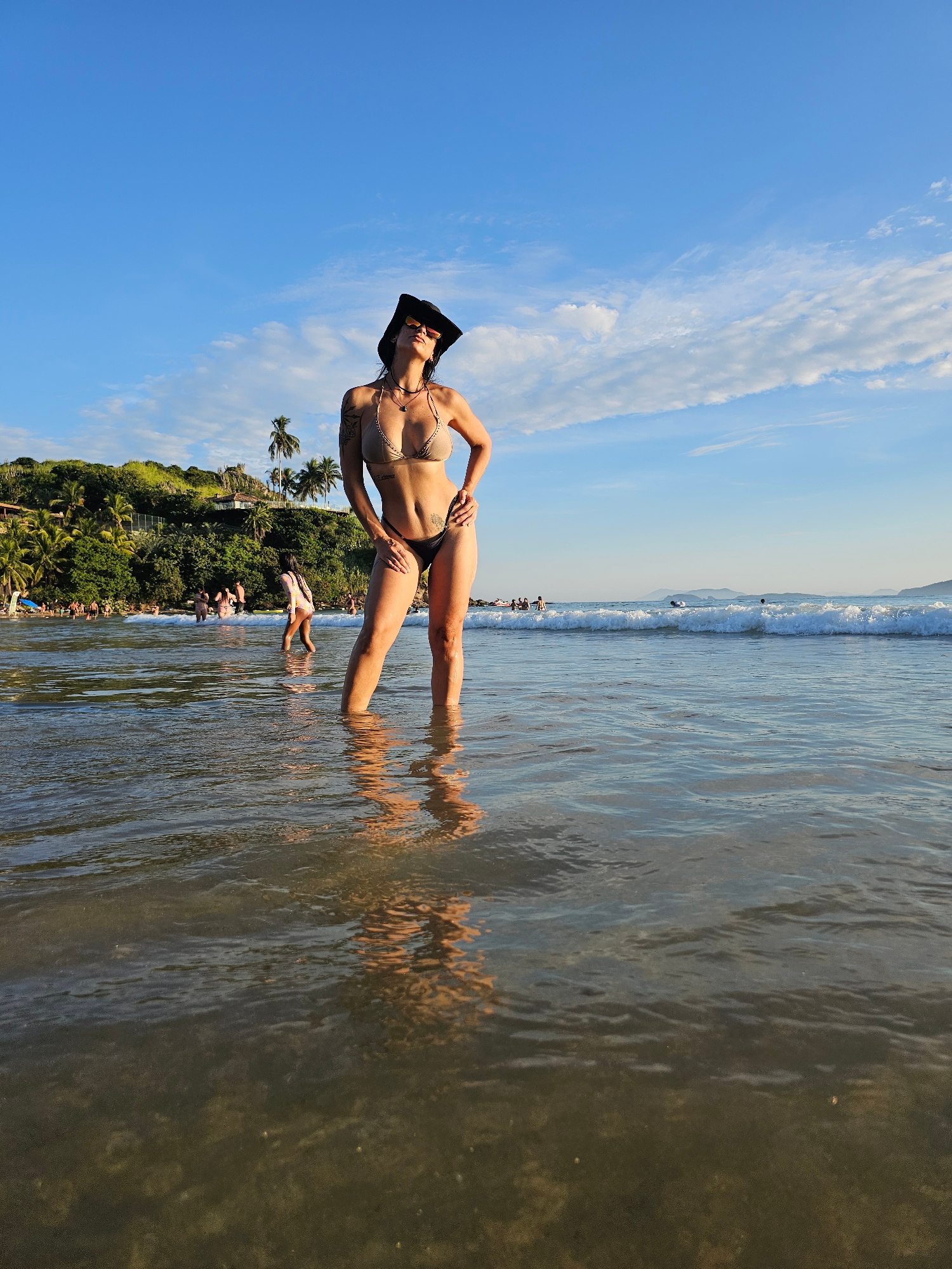 A woman in a bikini and a black hat is standing in the water at a beach. She is posing for the camera with her hands on her hips and her legs spread apart. The water is clear and shallow, and the sand…read more