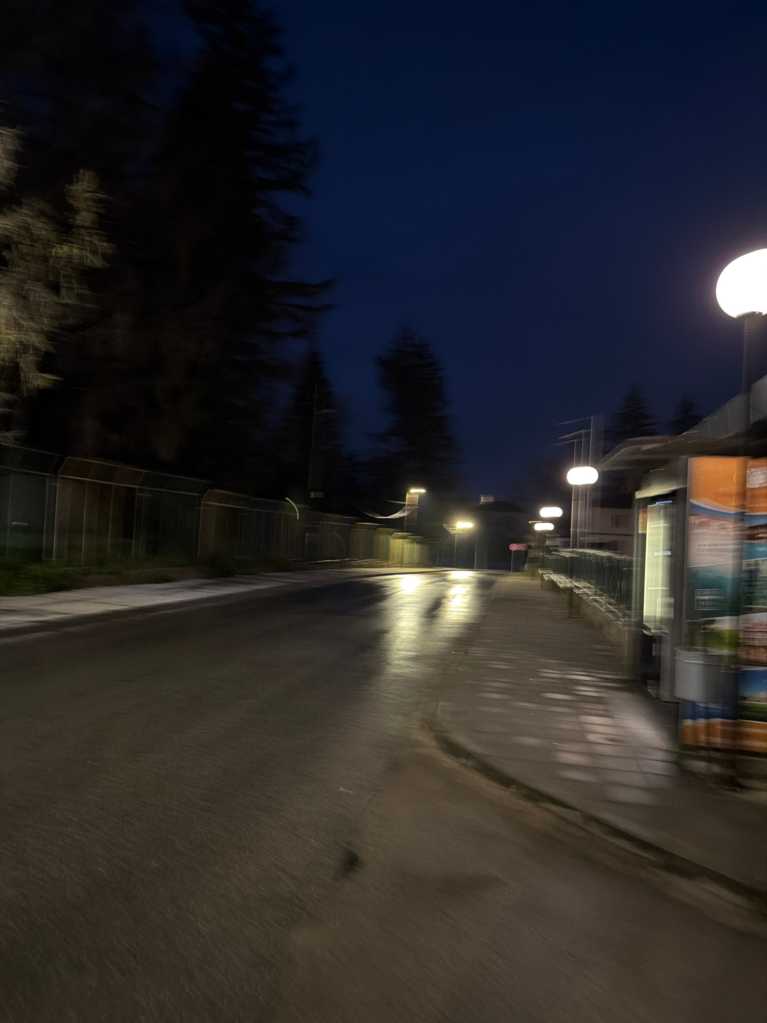 The image depicts a blurry, nighttime street scene in Panagyurishte, Bulgaria. Streetlights illuminate a sidewalk adjacent to a road, both appearing wet. To the left of the sidewalk, there's a steep s…read more
