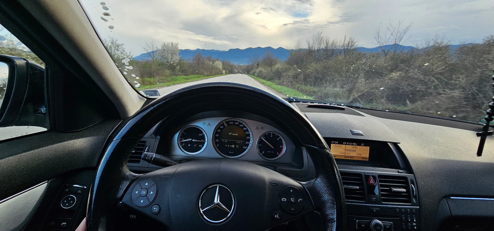 Captured from within a vehicle, the image showcases a driver's perspective of a road leading towards distant mountains under a sky filled with clouds. The car's dashboard and steering wheel, emblazone…read more