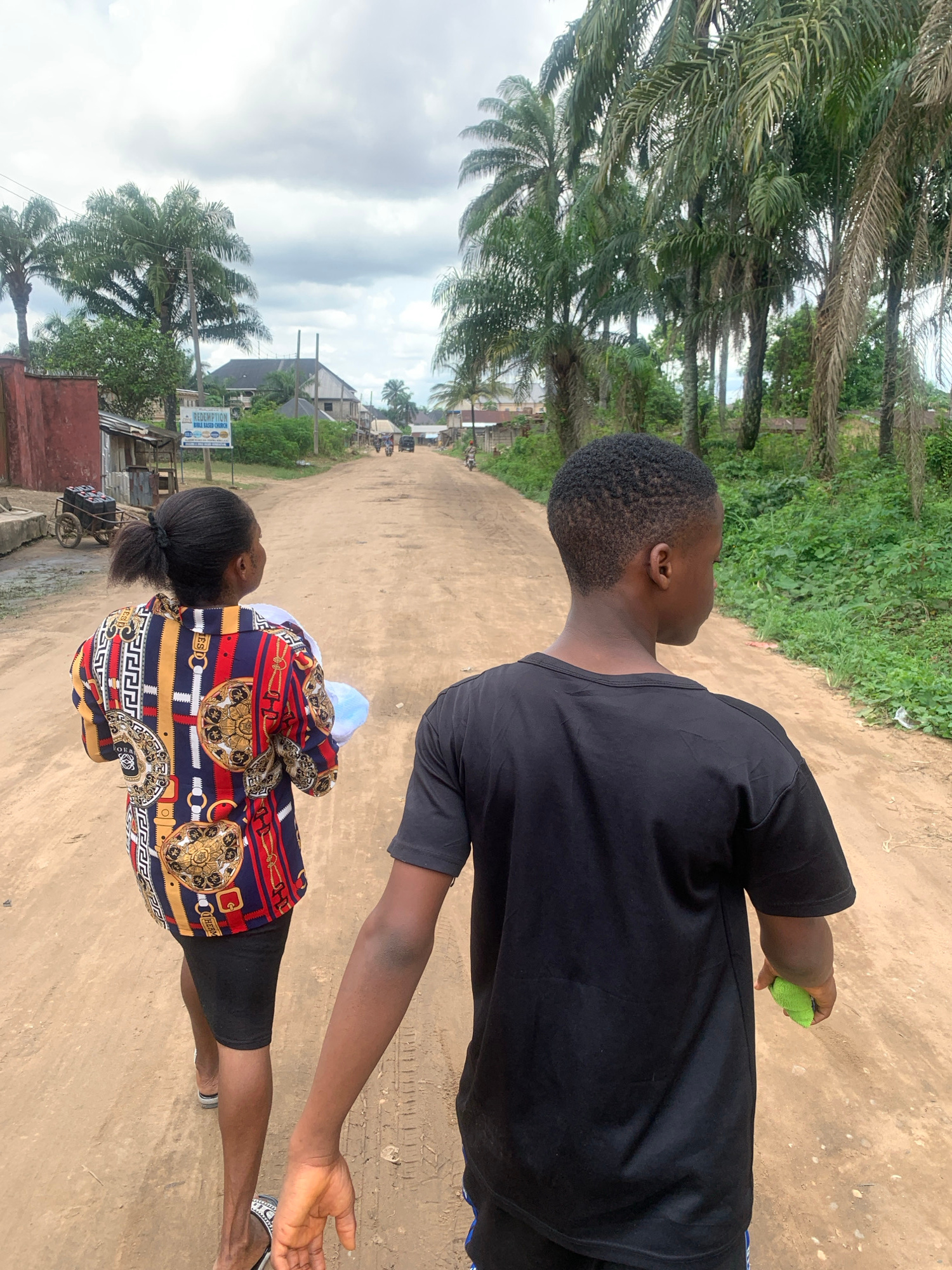 The image shows two individuals walking away from the camera on an unpaved, sandy road, likely in Aba, Nigeria. The scene is set outdoors under an overcast sky, with abundant green vegetation and nume…read more