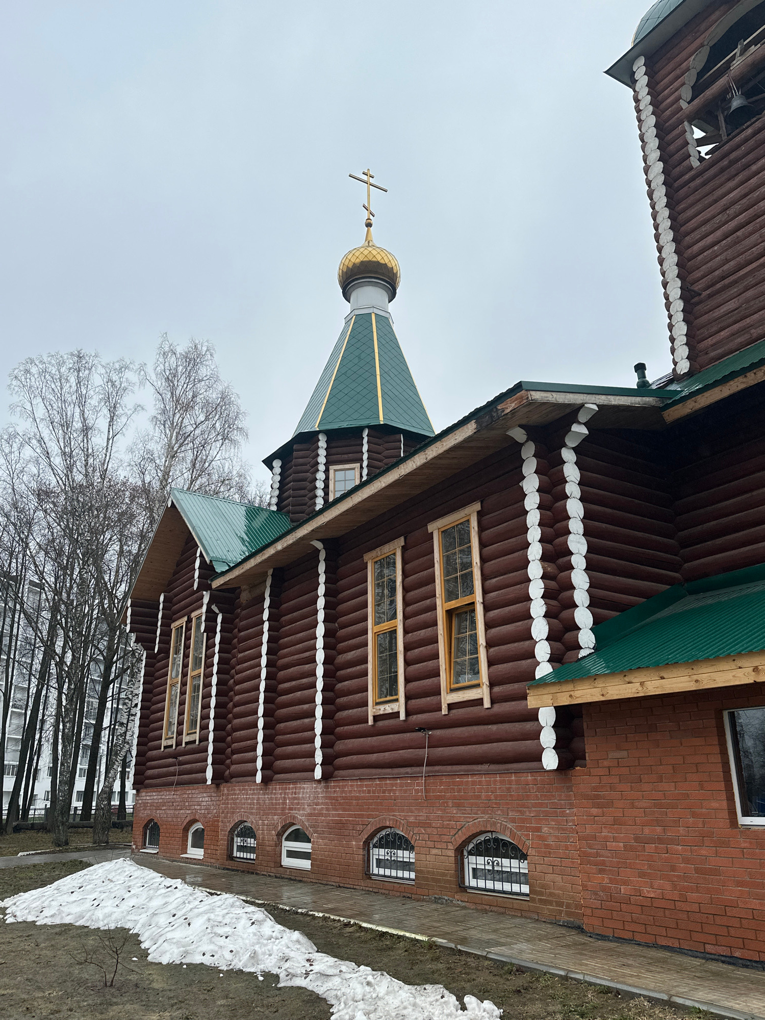 The image depicts a distinctive religious building, likely an Orthodox church or chapel, set against an overcast sky in Chaikovsky, Russia. The building's architecture is a blend of wooden log constru…read more