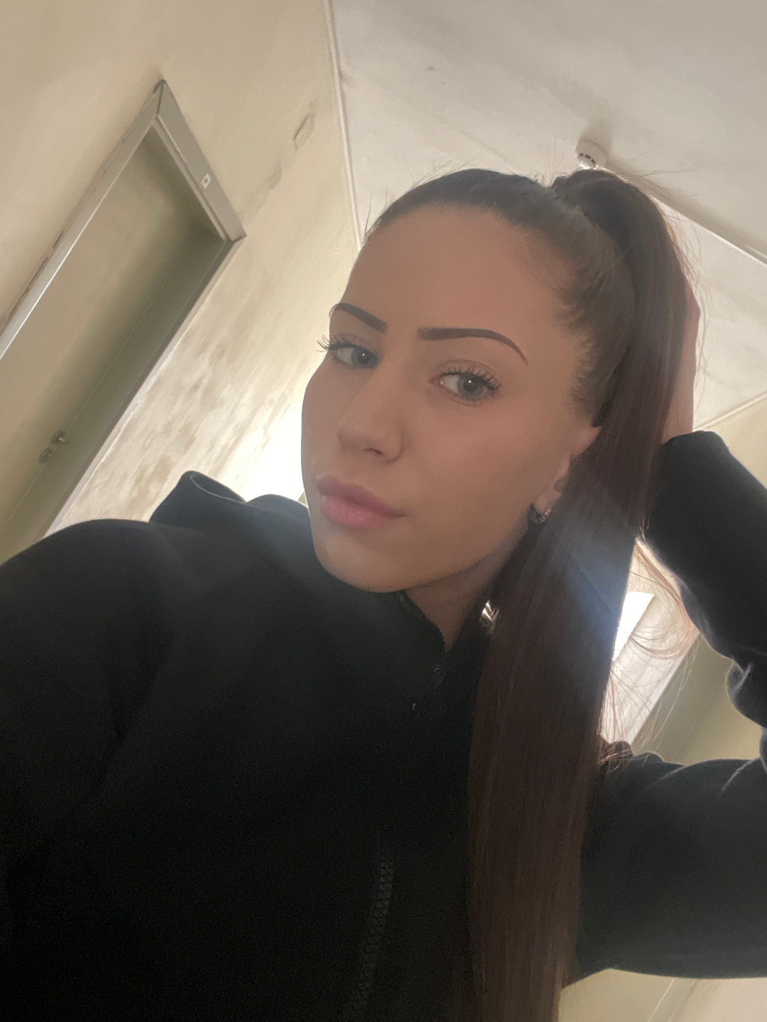 A young woman is taking a selfie in an indoor location. She has long, brown hair pulled into a high ponytail and is wearing a black hooded sweatshirt. The background appears to be a hallway with a lig…read more