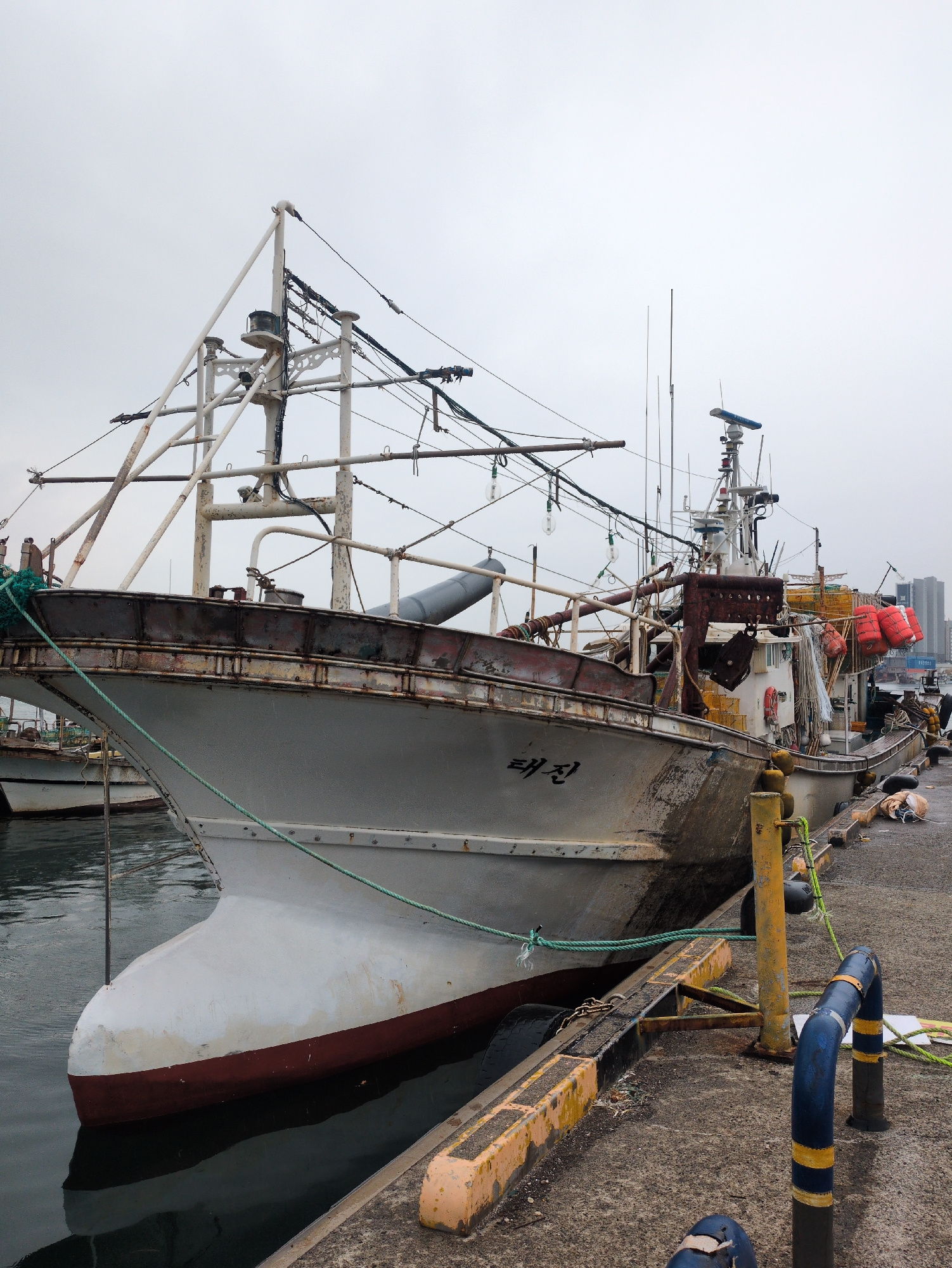 A large, weathered fishing vessel is depicted docked alongside a concrete pier in a working port, likely Ulsan, South Korea. The image, seemingly rotated, shows the boat positioned horizontally, with…read more