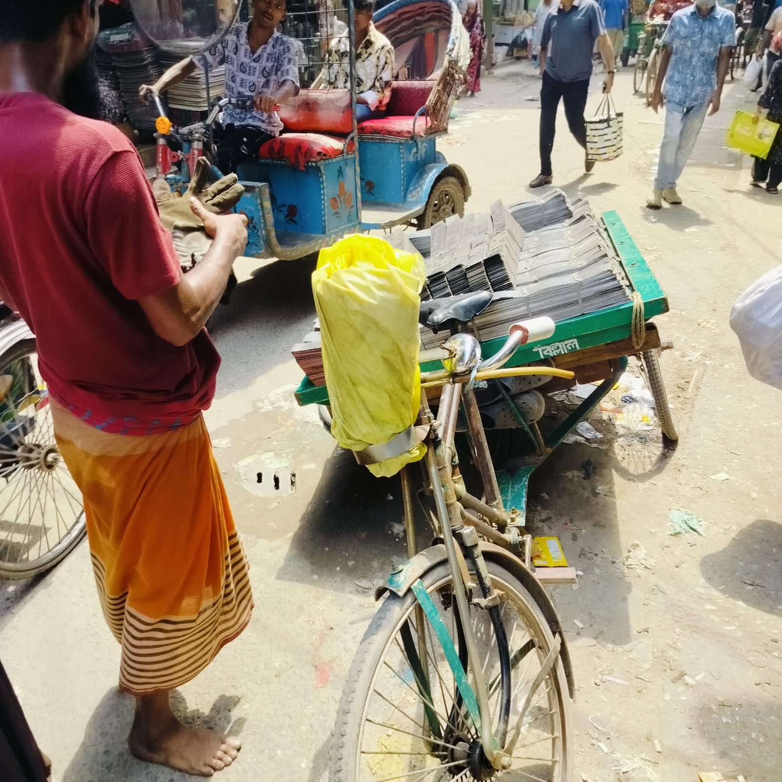 The image captures a bustling street scene in Dhaka, Bangladesh. A bare-footed man wearing a red shirt and orange and white striped sarong stands next to a bicycle modified into a vendor's cart. The c…read more