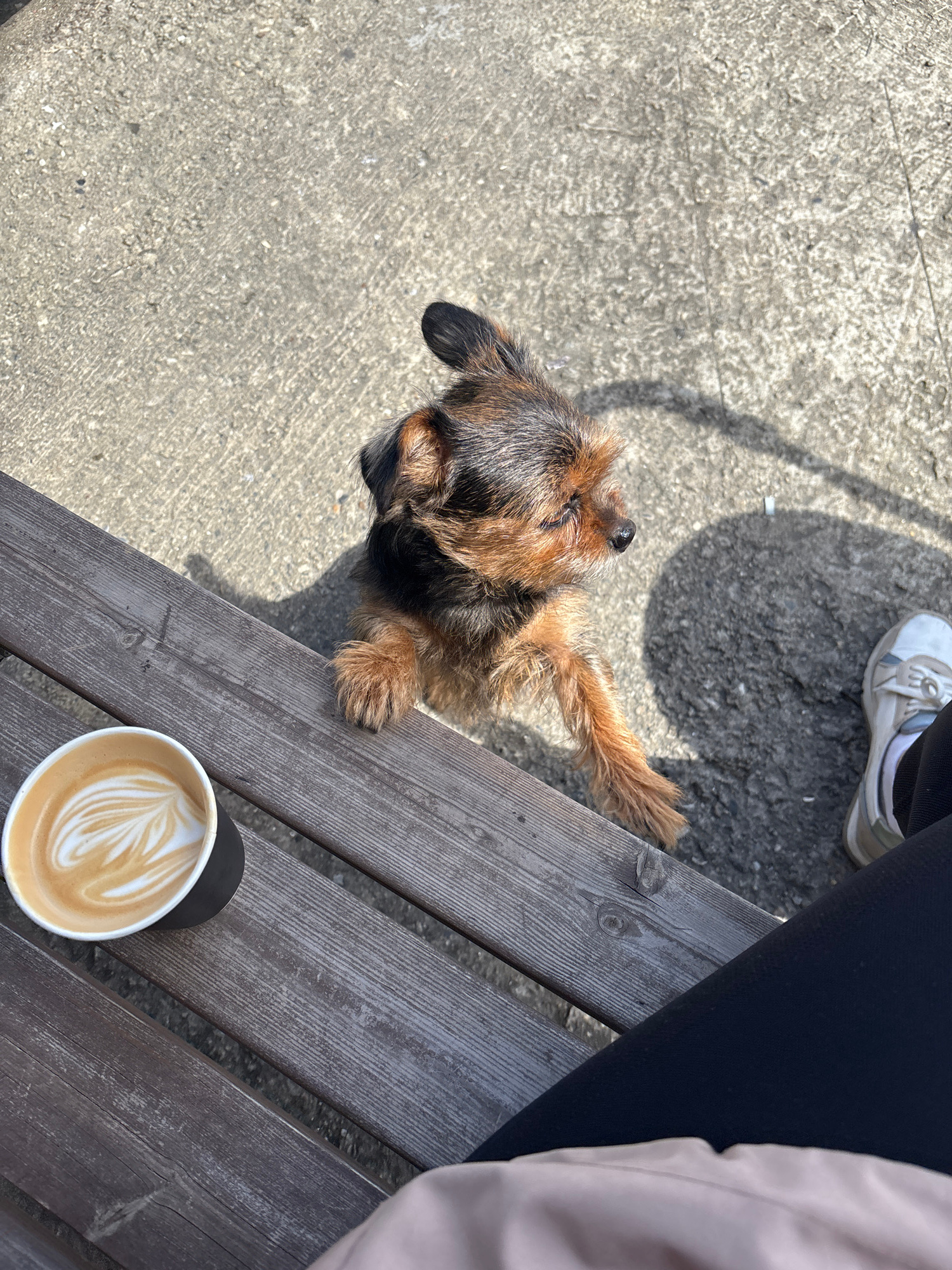 The image is a high-angle shot capturing a small, brown and black terrier-type dog reaching up with its front paws onto a wooden bench. A cup of latte with latte art sits on the bench, adjacent to the…read more