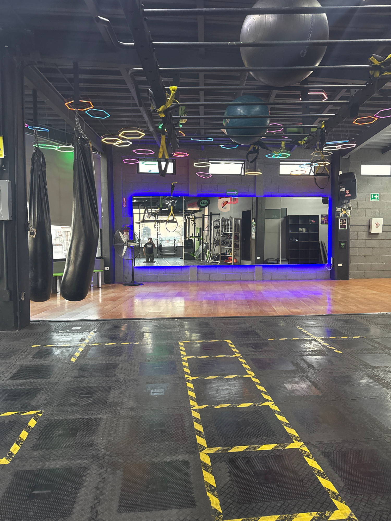 The image depicts the interior of a fitness center in Puebla, Mexico. The space contains workout equipment, including stability balls, suspension training systems, punching bags, and weight training m…read more