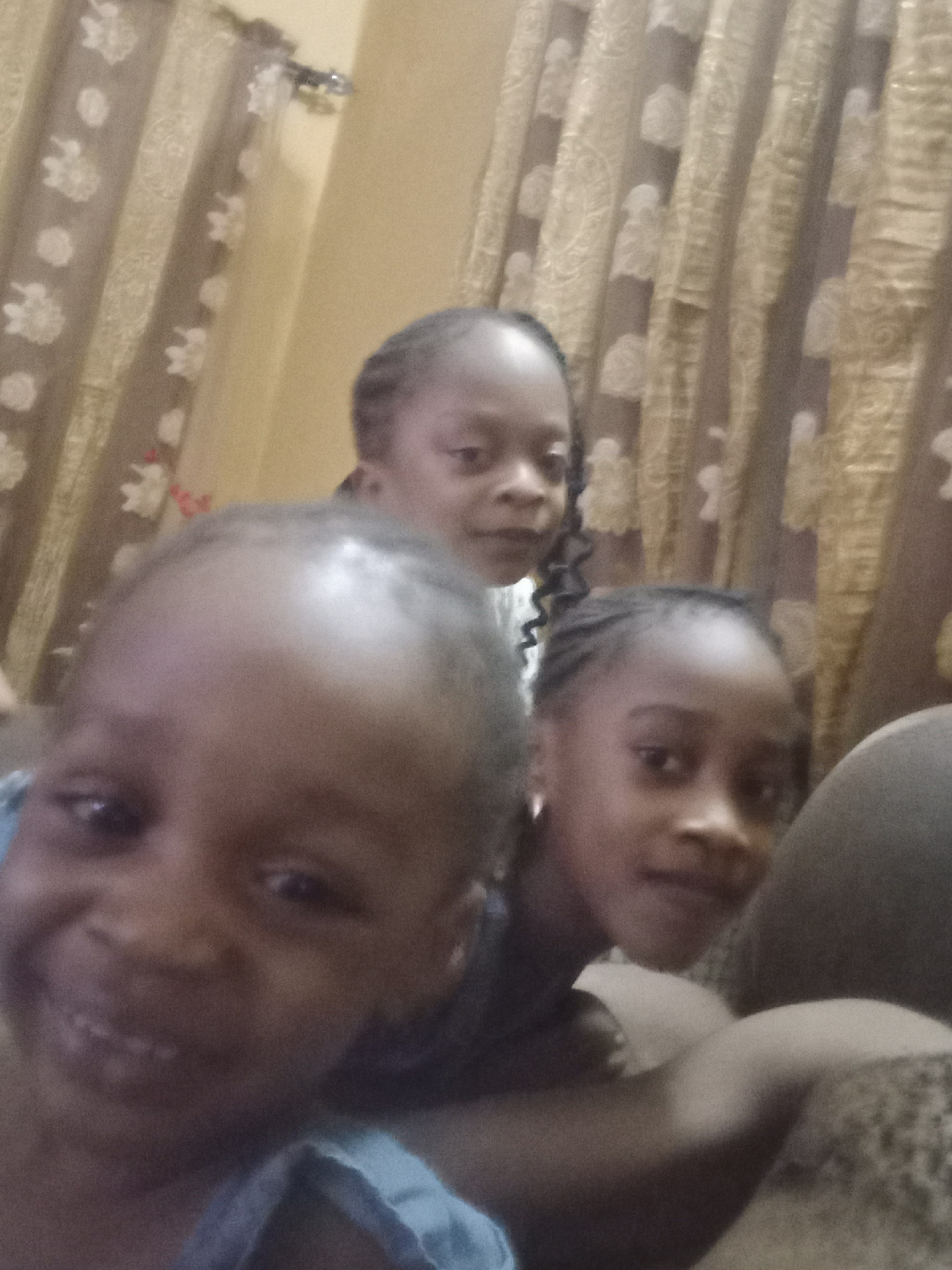 Three children are closely grouped together, facing the camera. The background includes curtains with a patterned design. The location is unknown.