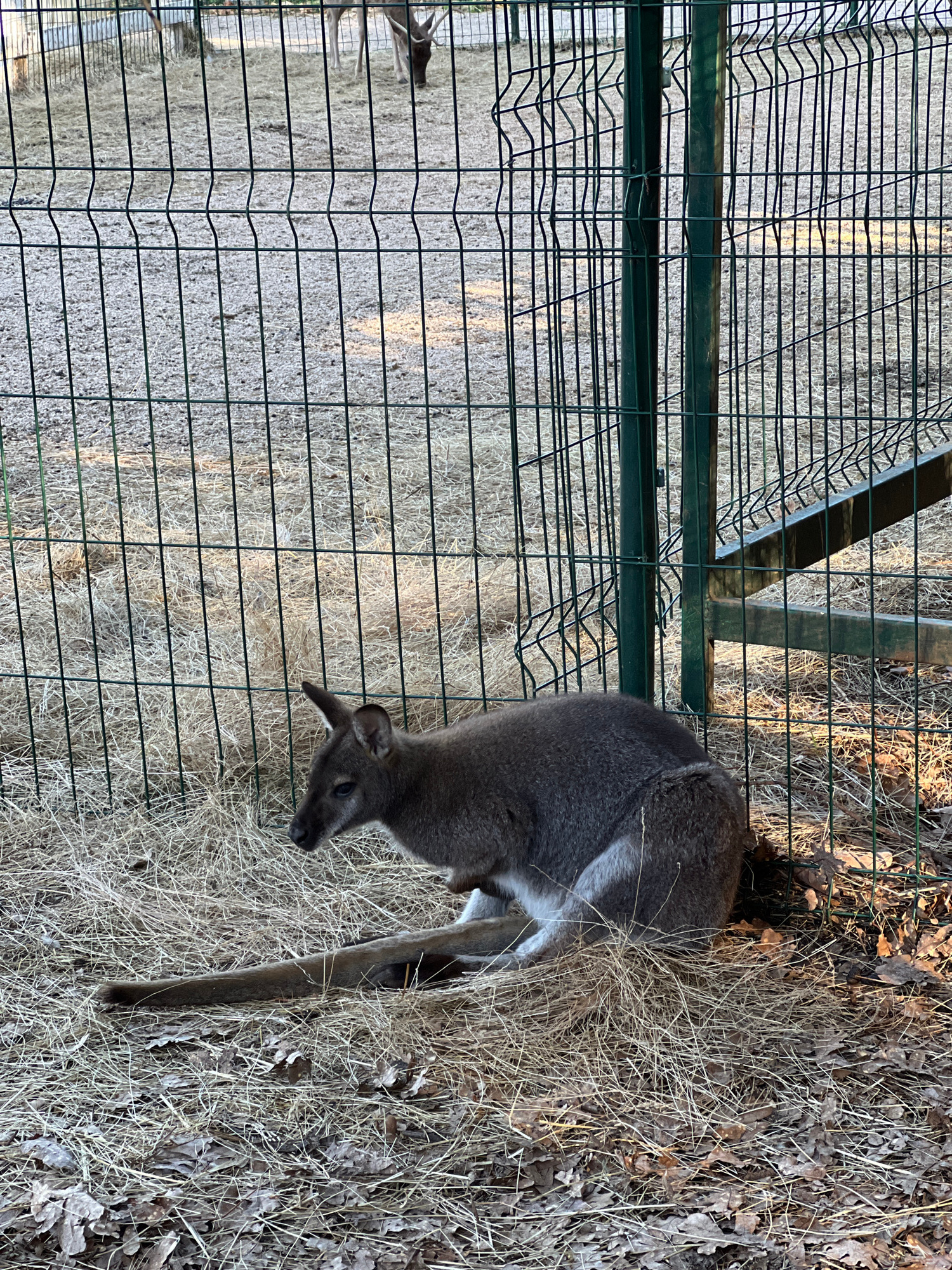 A kangaroo stands near a green wire fence in an enclosure partially covered with dry straw and leaves. Another kangaroo is partially visible in the bottom left corner of the image, inside the fence. T…read more