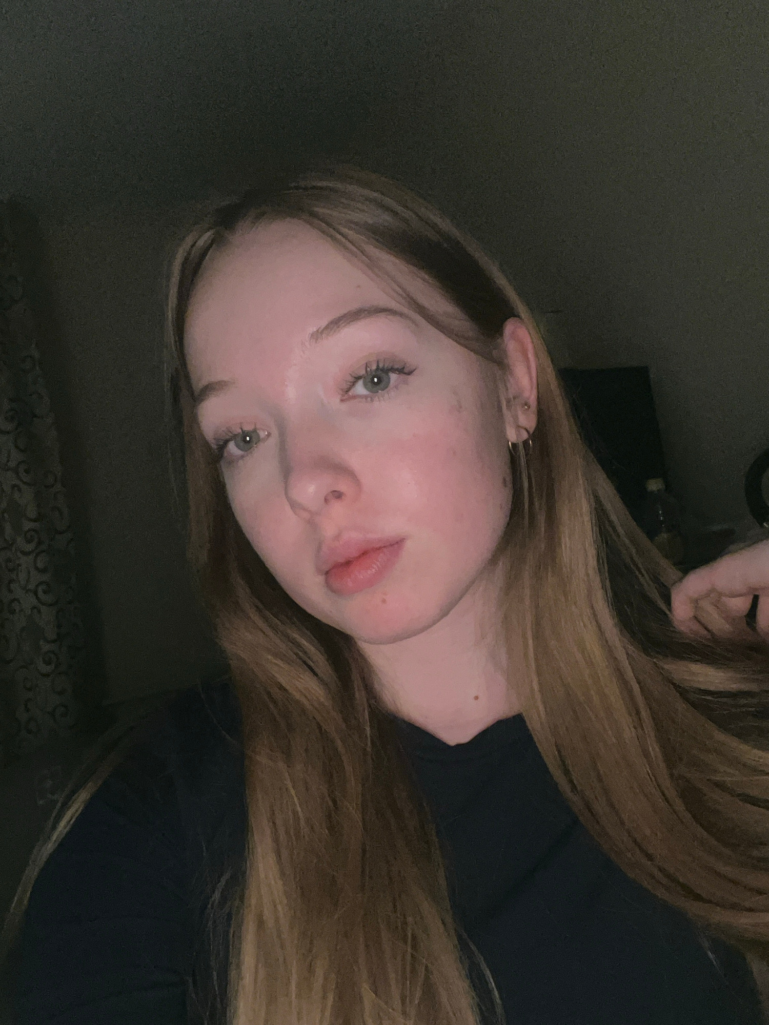 A young woman with long, light brown hair is the subject of this indoor, close-up photograph. Her face is angled towards the camera. She has fair skin, green eyes, and full lips. There is a small earr…read more