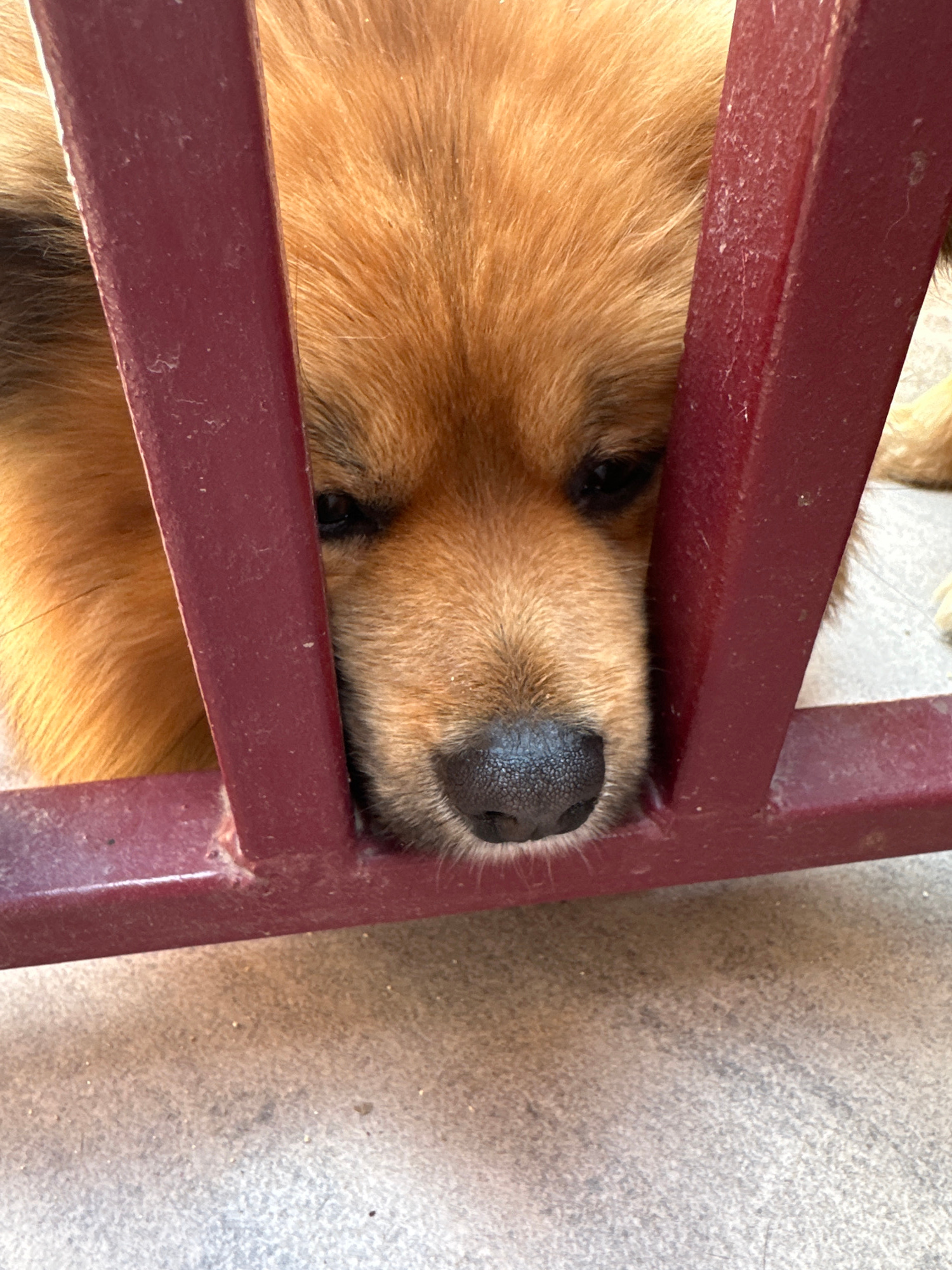 A close-up shows the head of a golden retriever dog seemingly stuck between the bars of a maroon-colored metal gate or railing. Only the dog's head, including its nose, eyes, and fur, is clearly visibβ¦read more