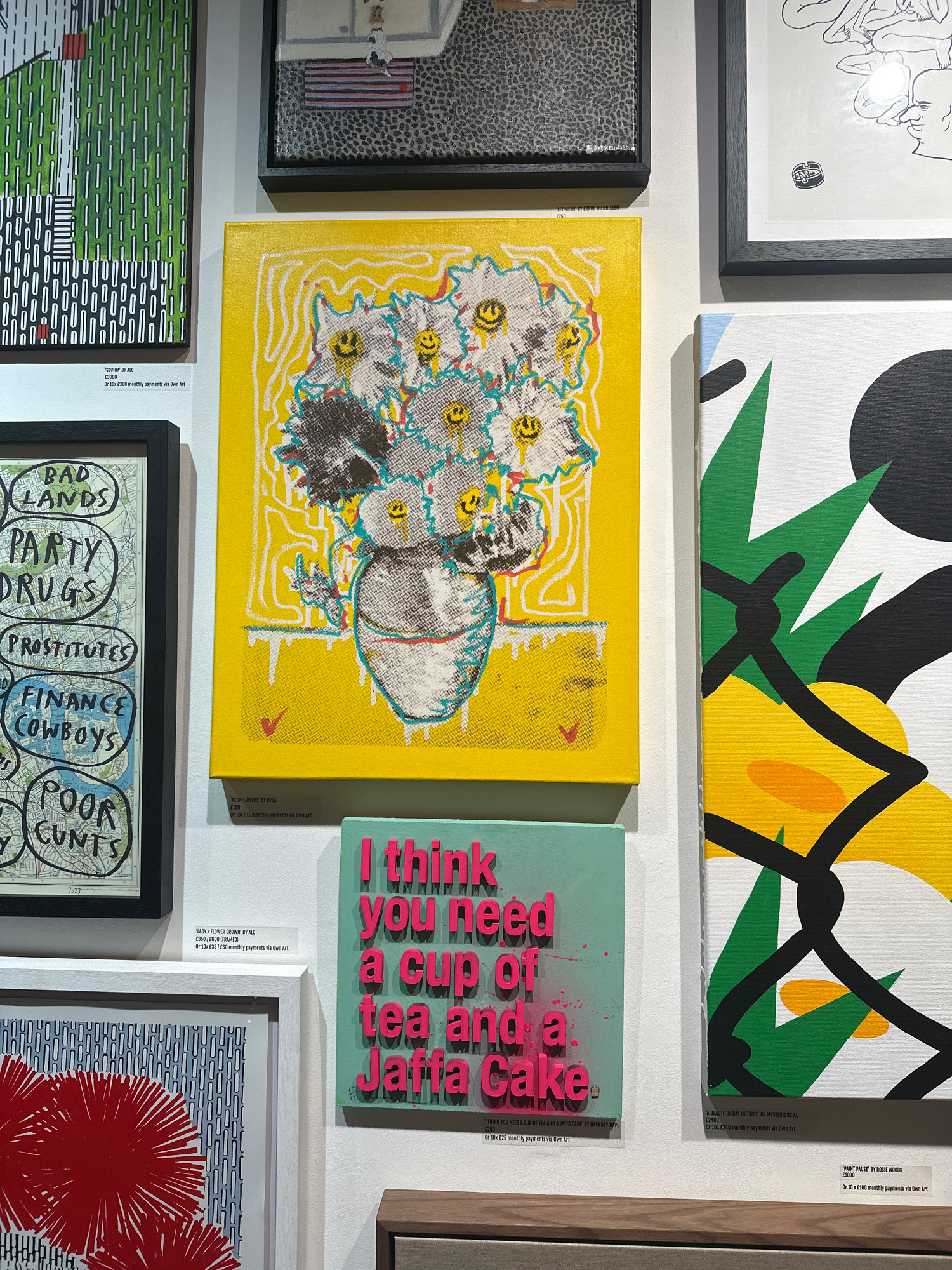 This media file captures a wall in an art gallery or exhibition, likely in London, United Kingdom, displaying a diverse collection of contemporary artworks. The scene shows multiple framed and unframe…read more