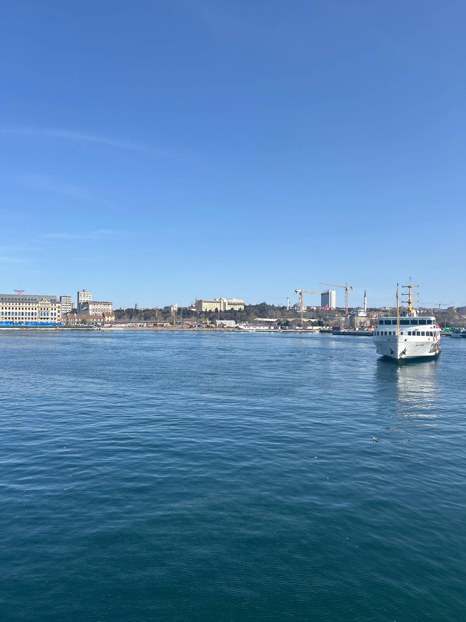The image shows a view of Kadıköy, Turkey from the water. The clear blue sky suggests a sunny day. The water is a deep blue, and its surface is slightly rippled. Buildings line the waterfront, appeari…read more