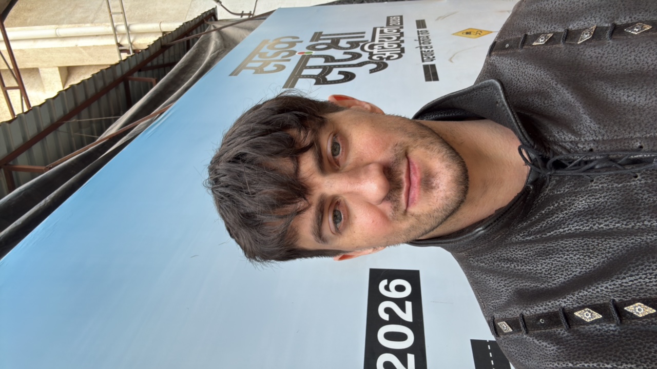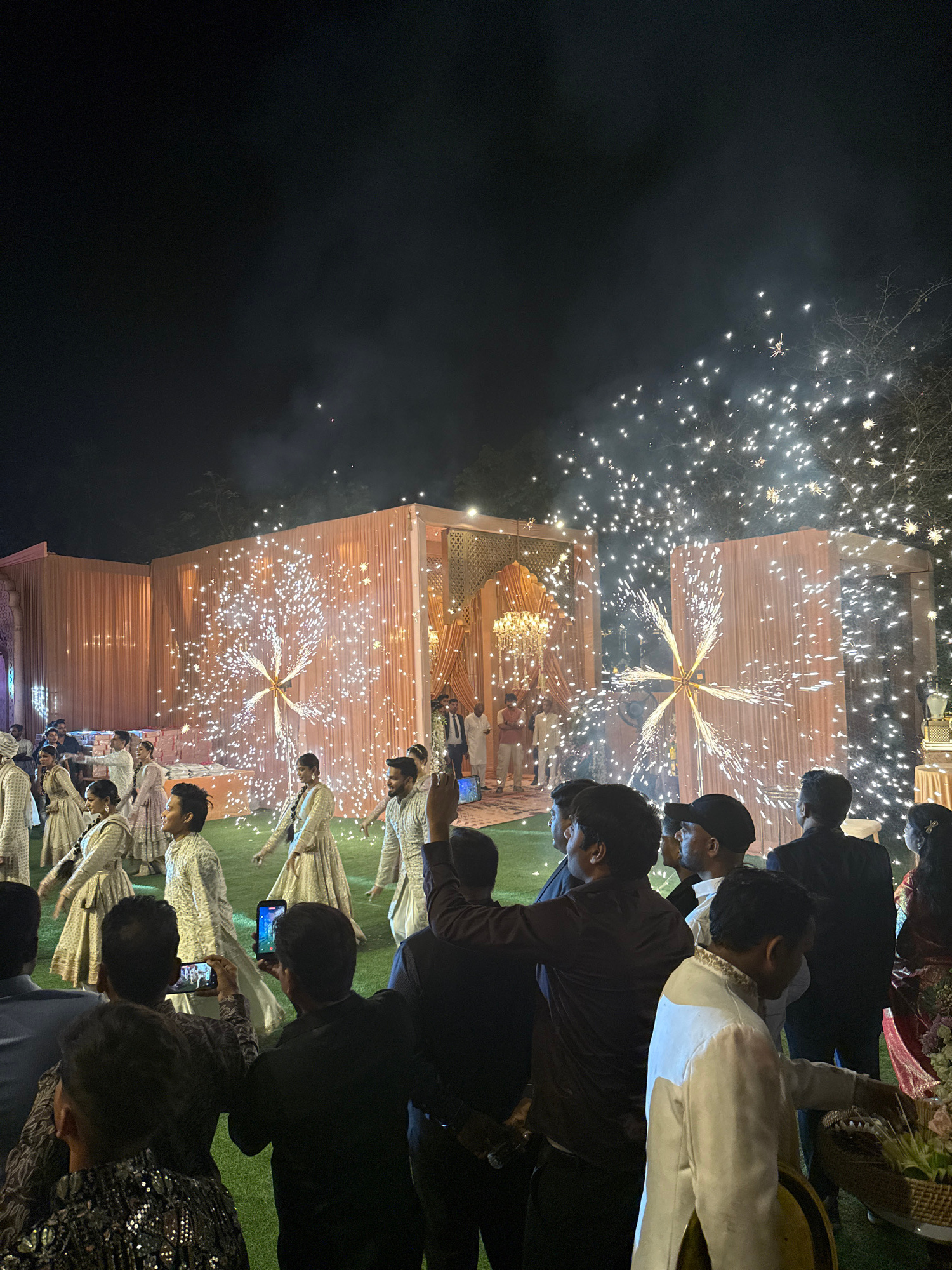 Captured at night, the image depicts an outdoor event likely in Delhi, India. In the foreground, numerous people are observed, many dressed in light-colored attire. Several individuals are holding up…read more