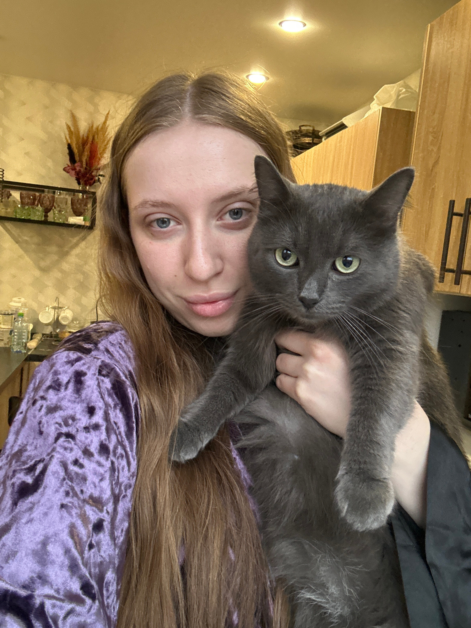 A selfie-style, slightly angled photograph shows a person holding a gray cat. The person has light skin, blue eyes, and long brown hair. They are wearing a purple velvet top. The cat has green eyes an…read more