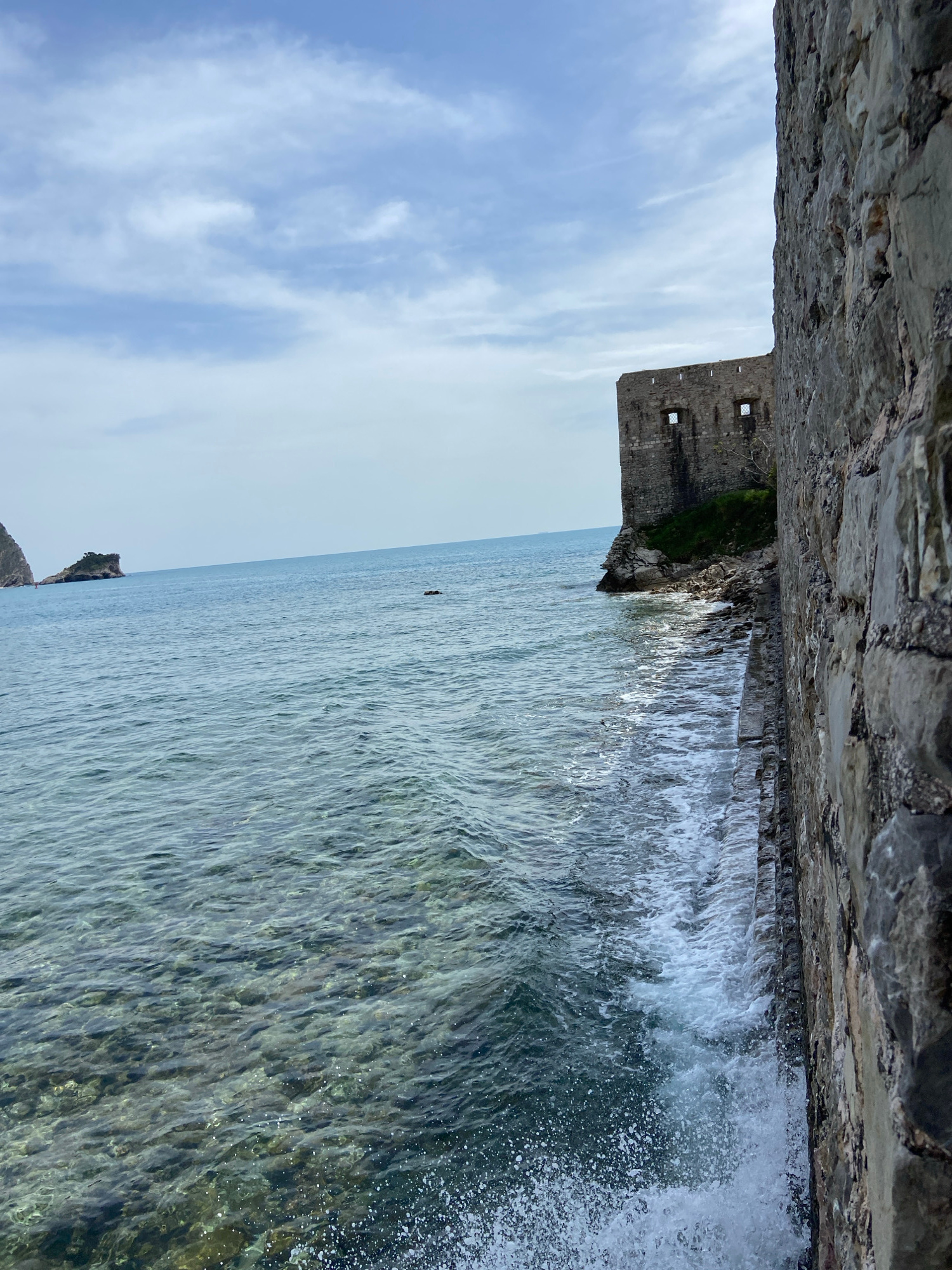 The image presents a scenic coastal view, likely from atop or beside an ancient stone structure. In the immediate foreground, a rugged, textured stone wall occupies the top third of the frame, hinting…read more