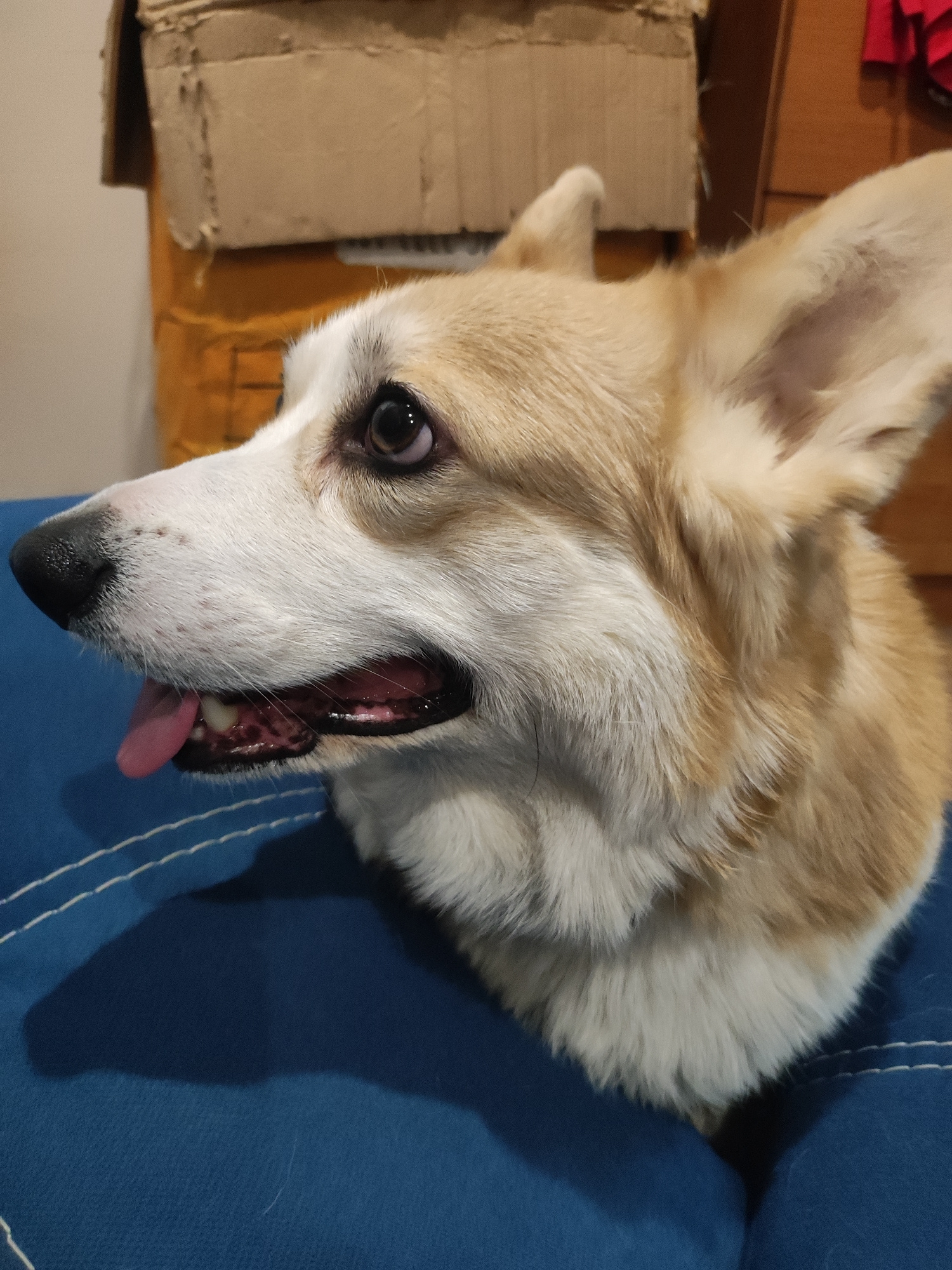 A close-up shot depicts a Corgi dog with tan and white fur, resting its head on a blue surface. The dog's mouth is slightly open, revealing its pink tongue. The dog's nose is black, and its eyes are d…read more