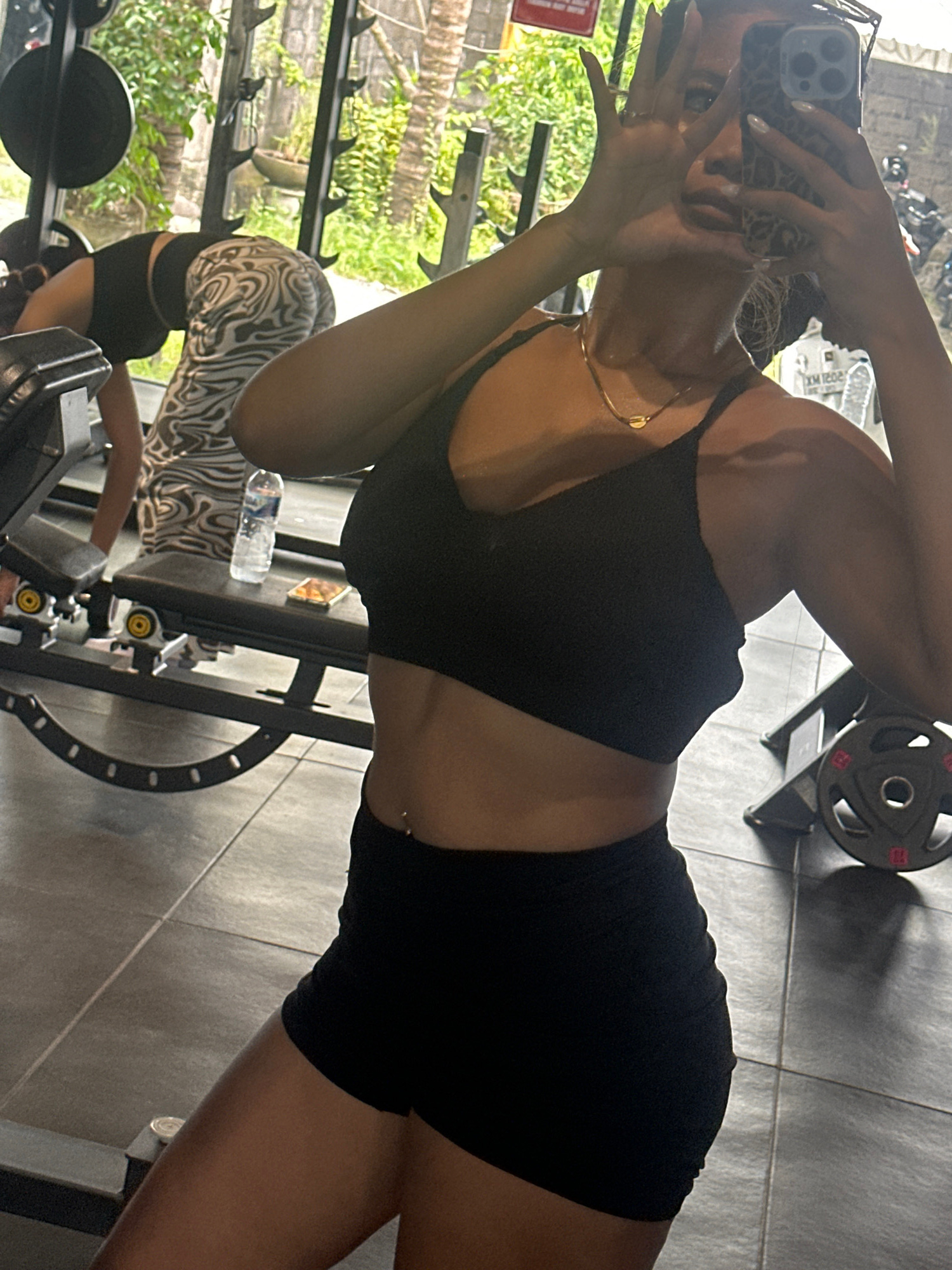 The scene depicts the interior of a gym or fitness center located in Batubulan Kangin, Indonesia. In the foreground, a female with medium skin tone is centered, taking a mirror selfie. She wears a bla…read more