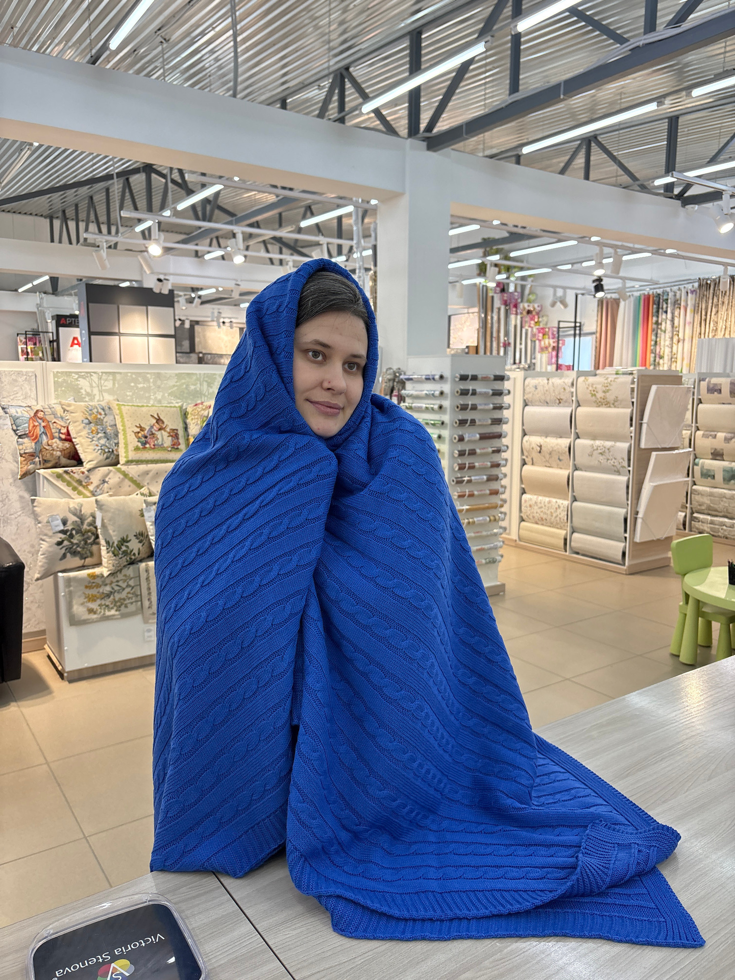 A vertical eye-level shot depicts a person wrapped in a blue cable-knit blanket, positioned in an interior space that appears to be a retail store. The person, likely a woman, has medium-length brown…read more