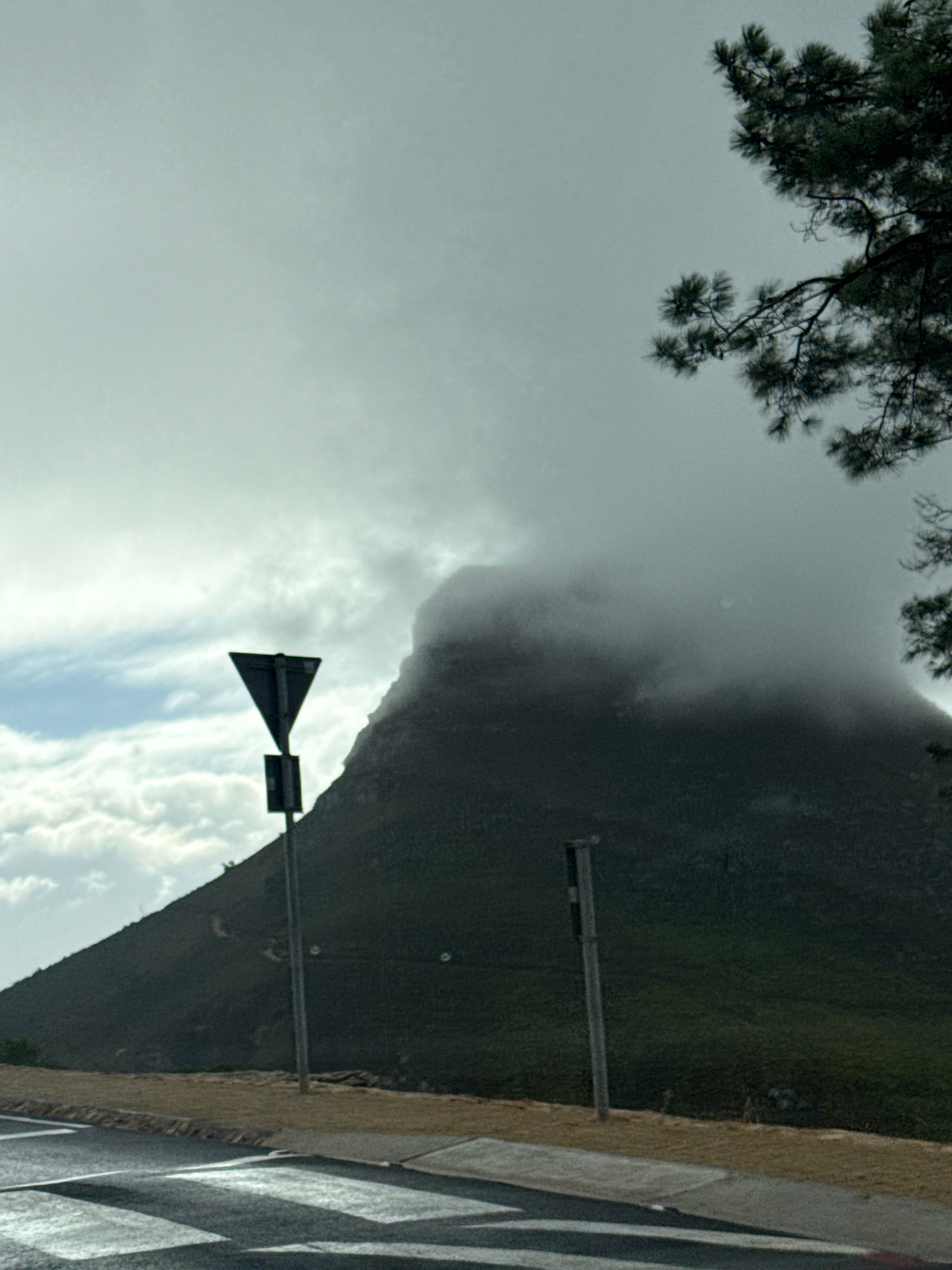 This image depicts a misty mountain landscape seen from the side of a road, characteristic of a location like Cape Town, South Africa. The primary subject is a large mountain slope, dark green with ve…read more