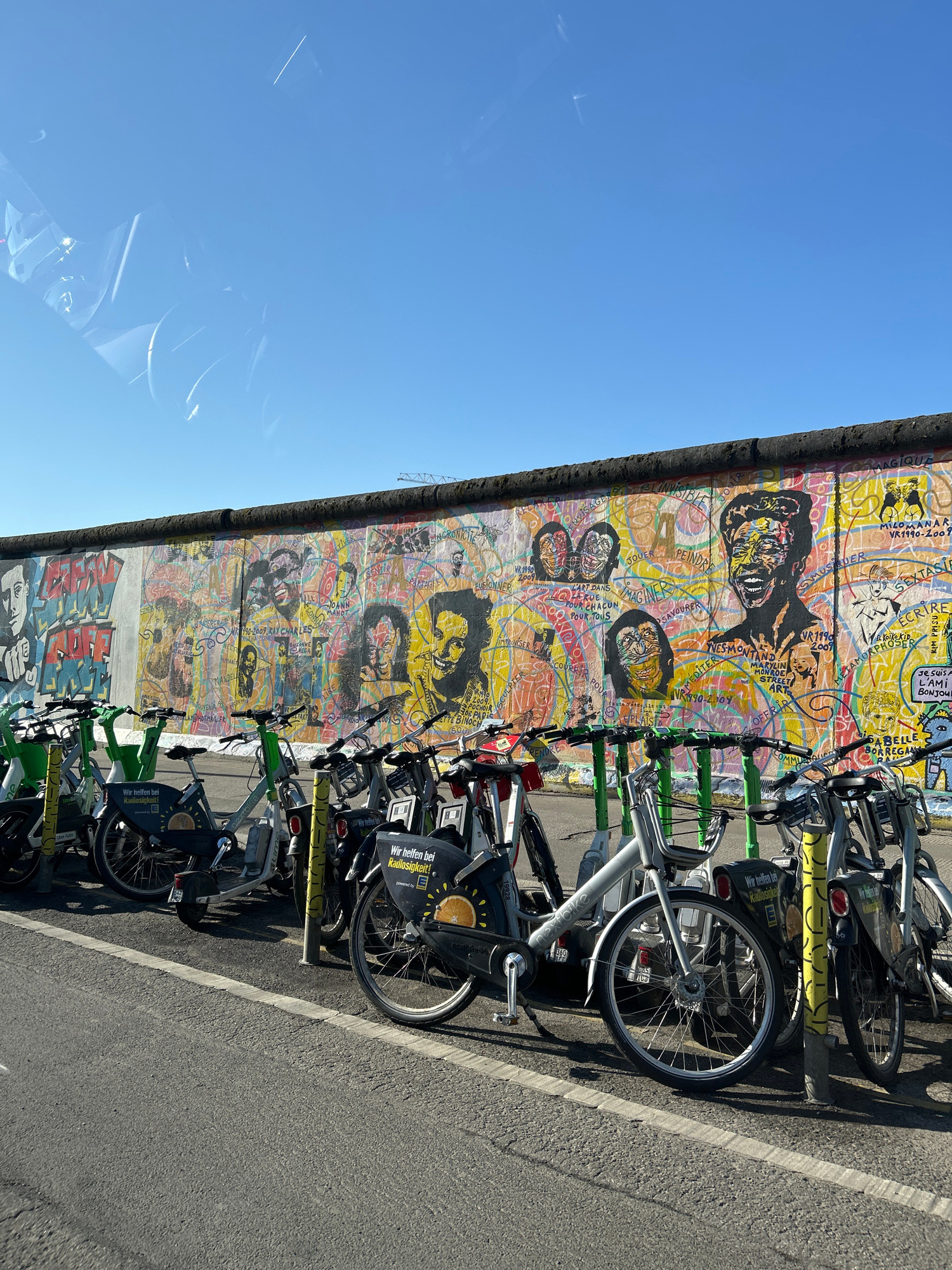 The image presents a vibrant outdoor scene in Berlin, Germany, capturing a segment of the iconic Berlin Wall, extensively covered in colorful street art. A long line of shared bicycles is neatly parke…read more