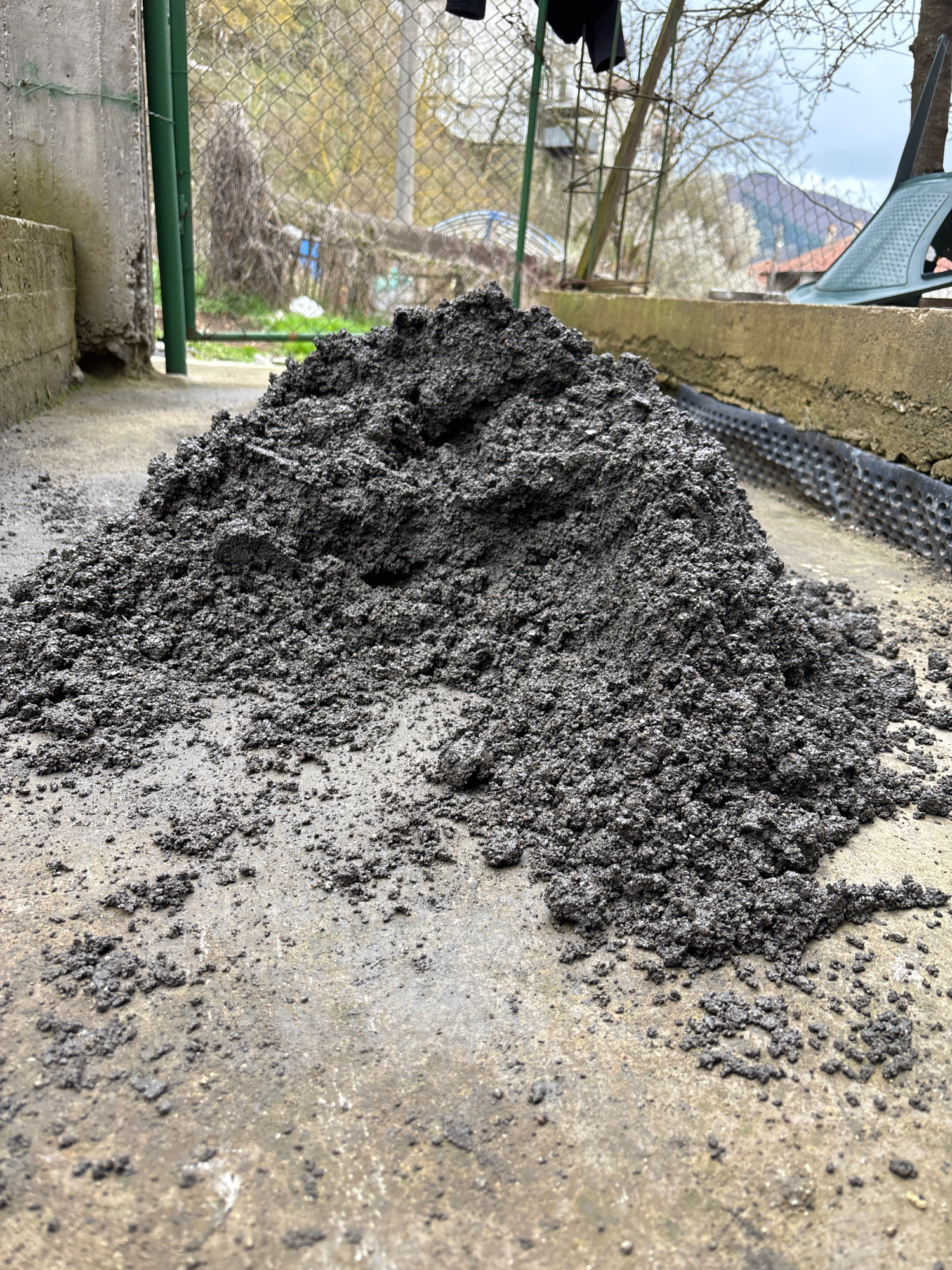 The scene is an outdoor ground-level view within a utility or residential area in Zlatograd, Bulgaria. A conical pile of dark gray, granular, and visibly moist material, approximately 0.5 meters high…read more