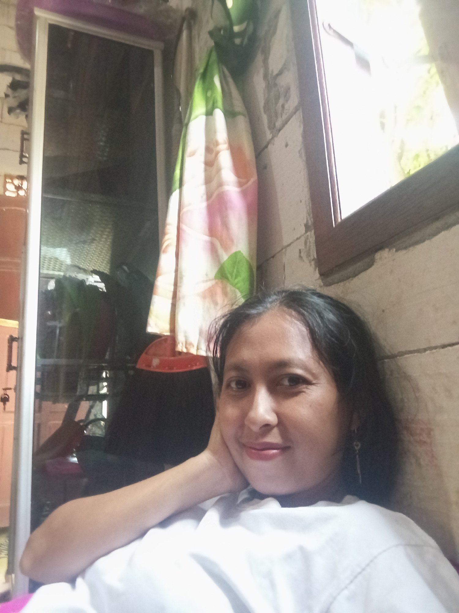 A woman is lying on a tile floor. She is positioned next to a low-lying white-framed structure. Behind her is a package wrapped in printed fabric. A window with a dark brown frame is visible on the fl…read more