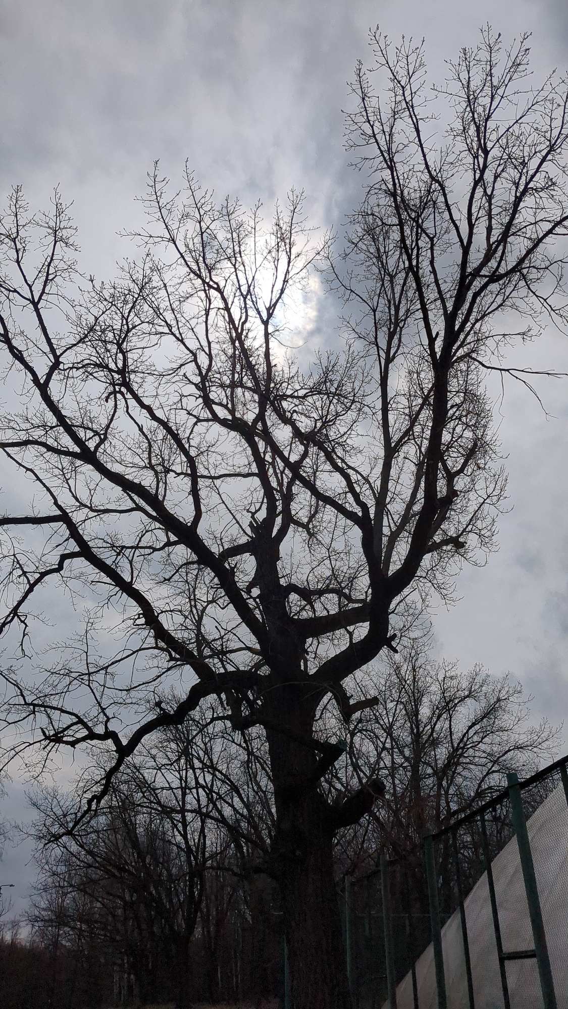 The image shows a bare tree with intricate branching patterns silhouetted against a cloudy sky. The sun is partially obscured by the clouds, creating a bright spot in the center of the frame. A buildi…read more