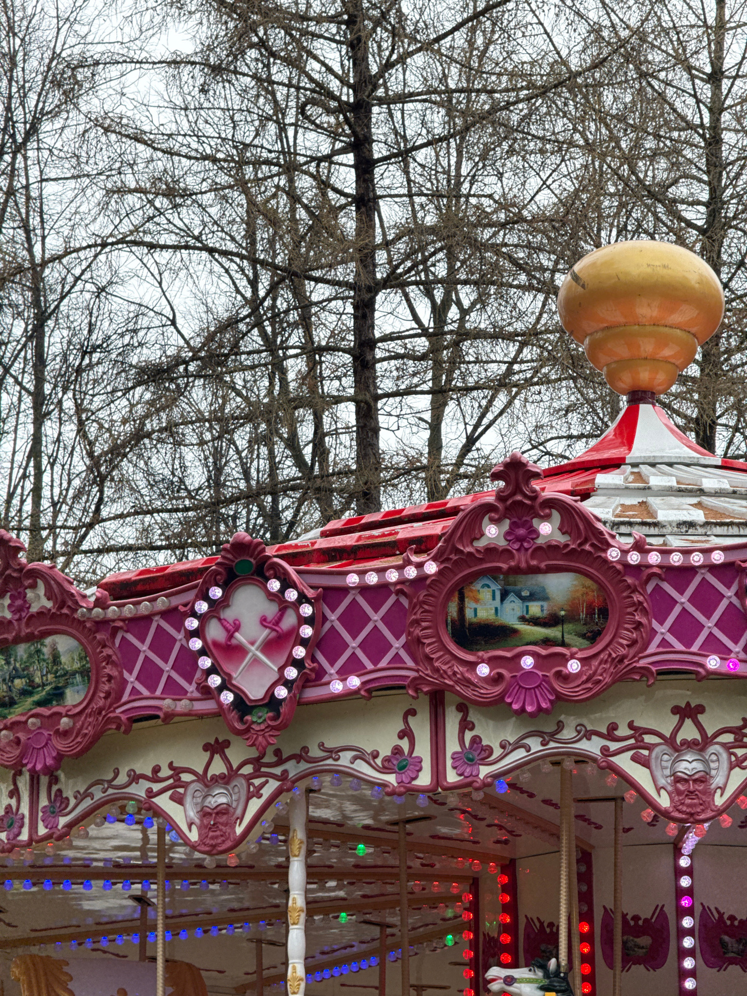 The image captures a section of a merry-go-round located in Perm, Russia, with bare tree branches in the background. The merry-go-round is decorated in a whimsical style, with a color scheme of pink,…read more