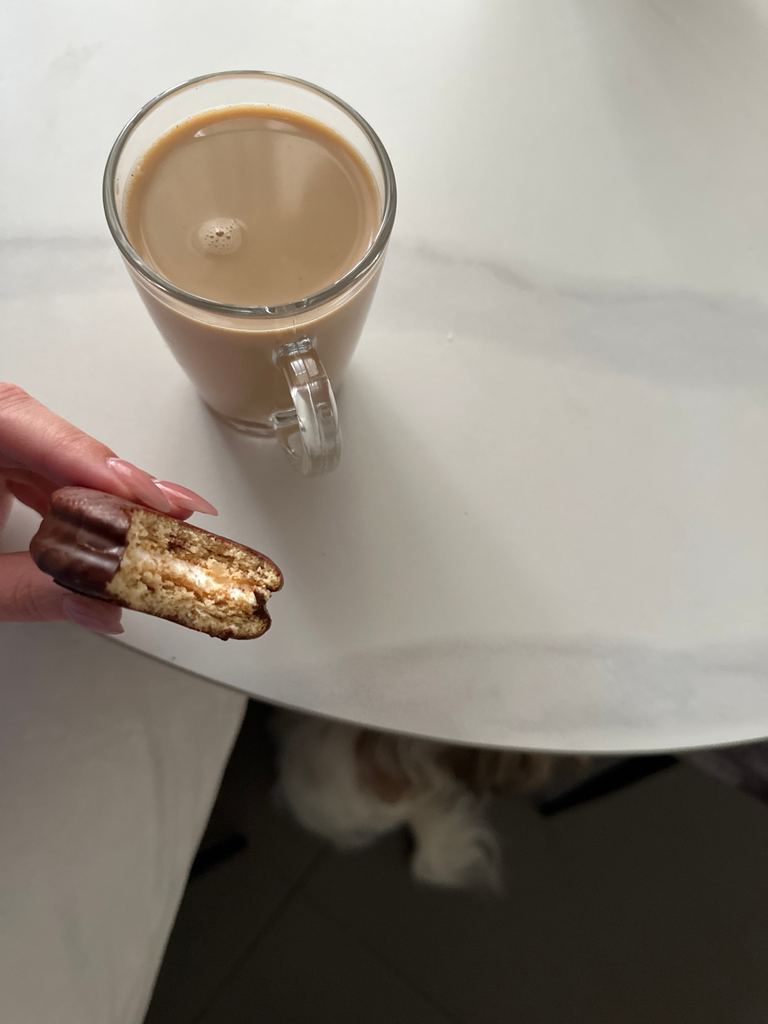 A top-down shot depicts a clear glass mug containing a light brown beverage, likely coffee or latte, resting on a white, marble-patterned surface. Beside the mug, a hand with long, manicured nails hol…read more