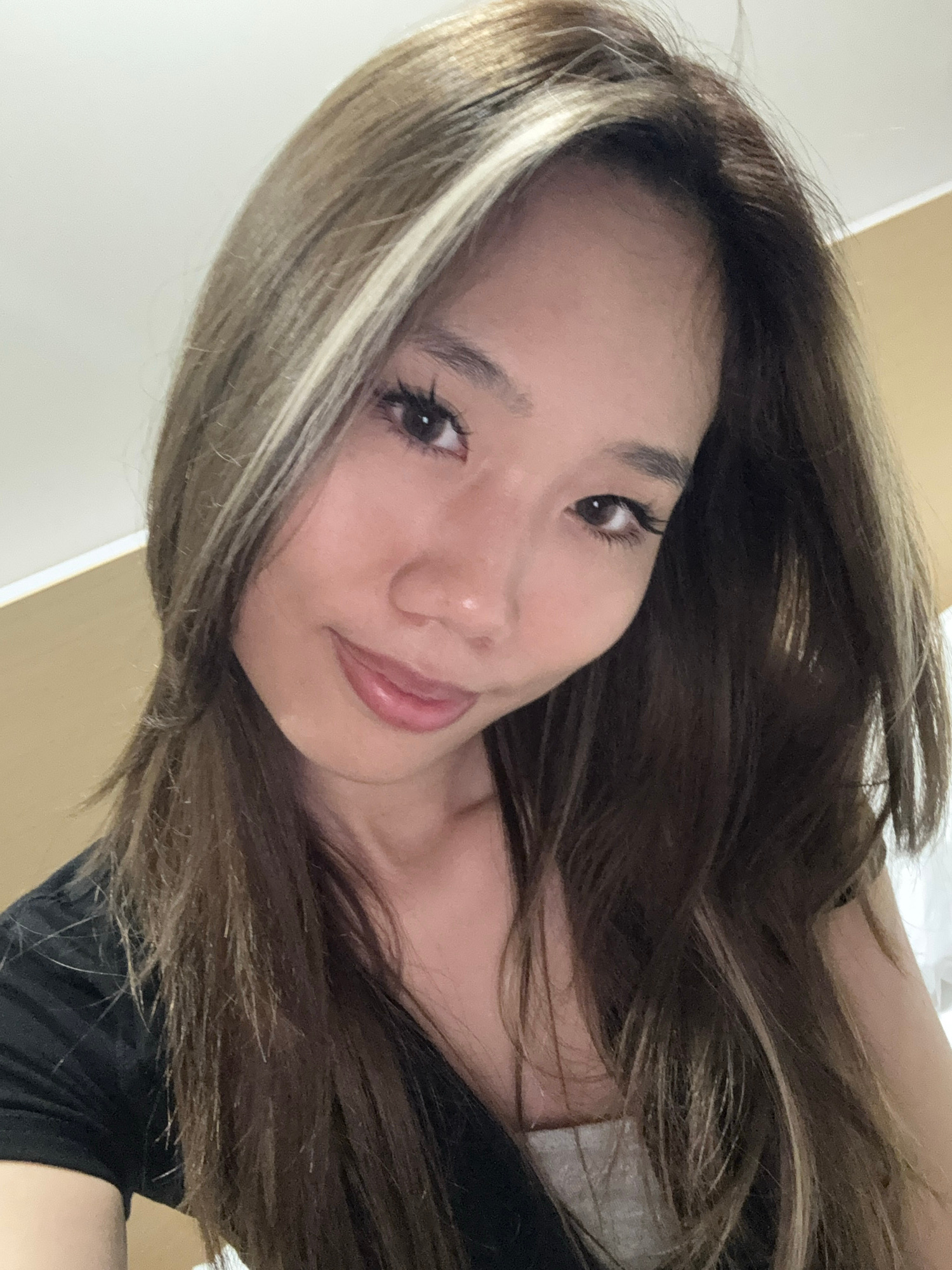 A close-up selfie of a woman with long brown hair highlighted with blonde streaks. She has fair skin, dark eyes, and is smiling subtly. She is wearing a black shirt. The background is a blurred, light…read more