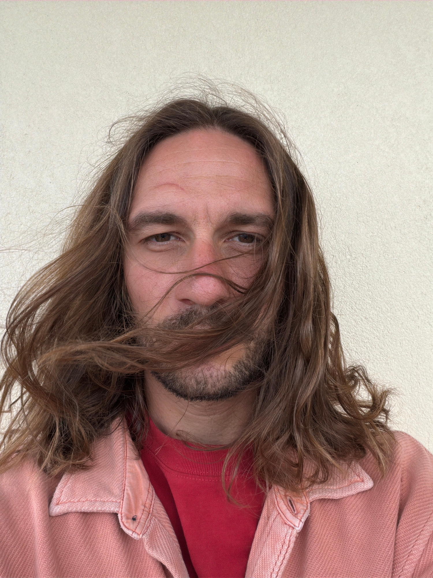 A man with long, brown hair and a beard is centered in the frame, angled such that his head is towards the bottom left. He is wearing a reddish-pink shirt under a similar-colored jacket. The backgroun…read more