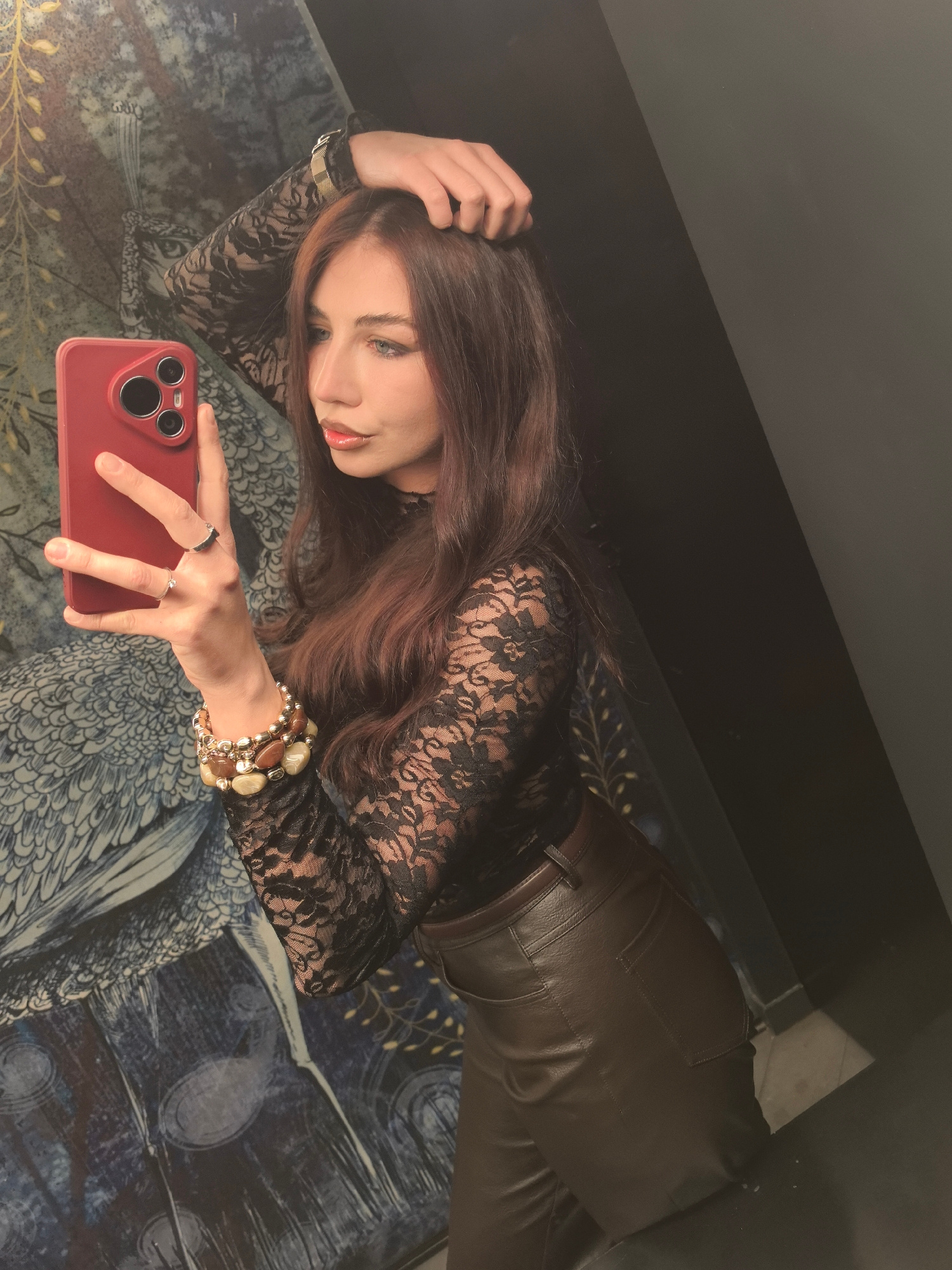 A person takes a mirror selfie in what appears to be a lavatory. The person has long, wavy, auburn hair, fair skin, and blue eyes. They are wearing a black lace top, brown leather pants, and bracelets…read more