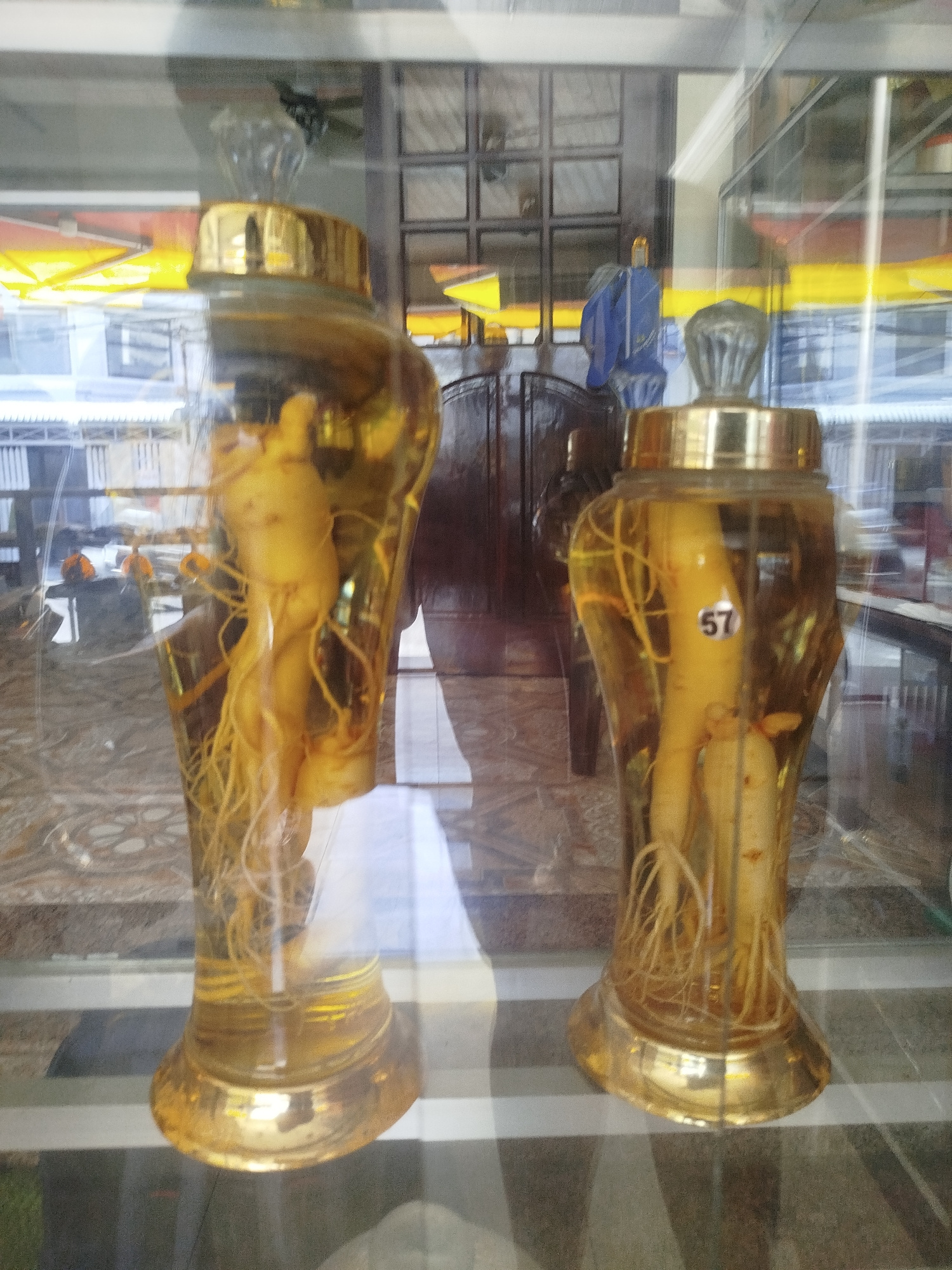 Two large glass jars, each containing a ginseng root submerged in a clear liquid, are displayed behind glass. The jars have ornate gold-colored bases and lids, with decorative glass knobs on top. One…read more