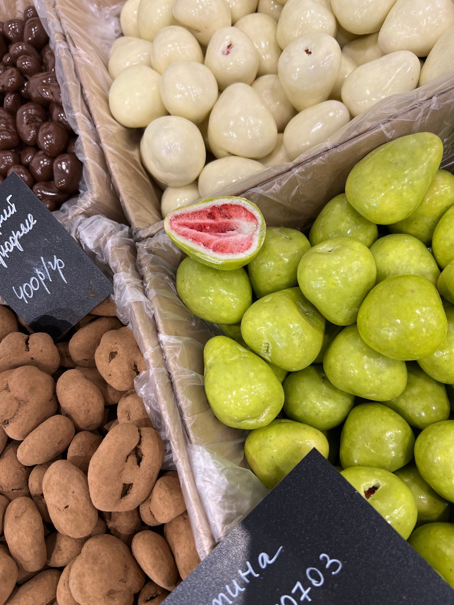 The image shows a display of chocolate-covered fruits in a store in an unknown city. The fruits are arranged in four sections within a cardboard container lined with plastic. The top left section featβ¦read more