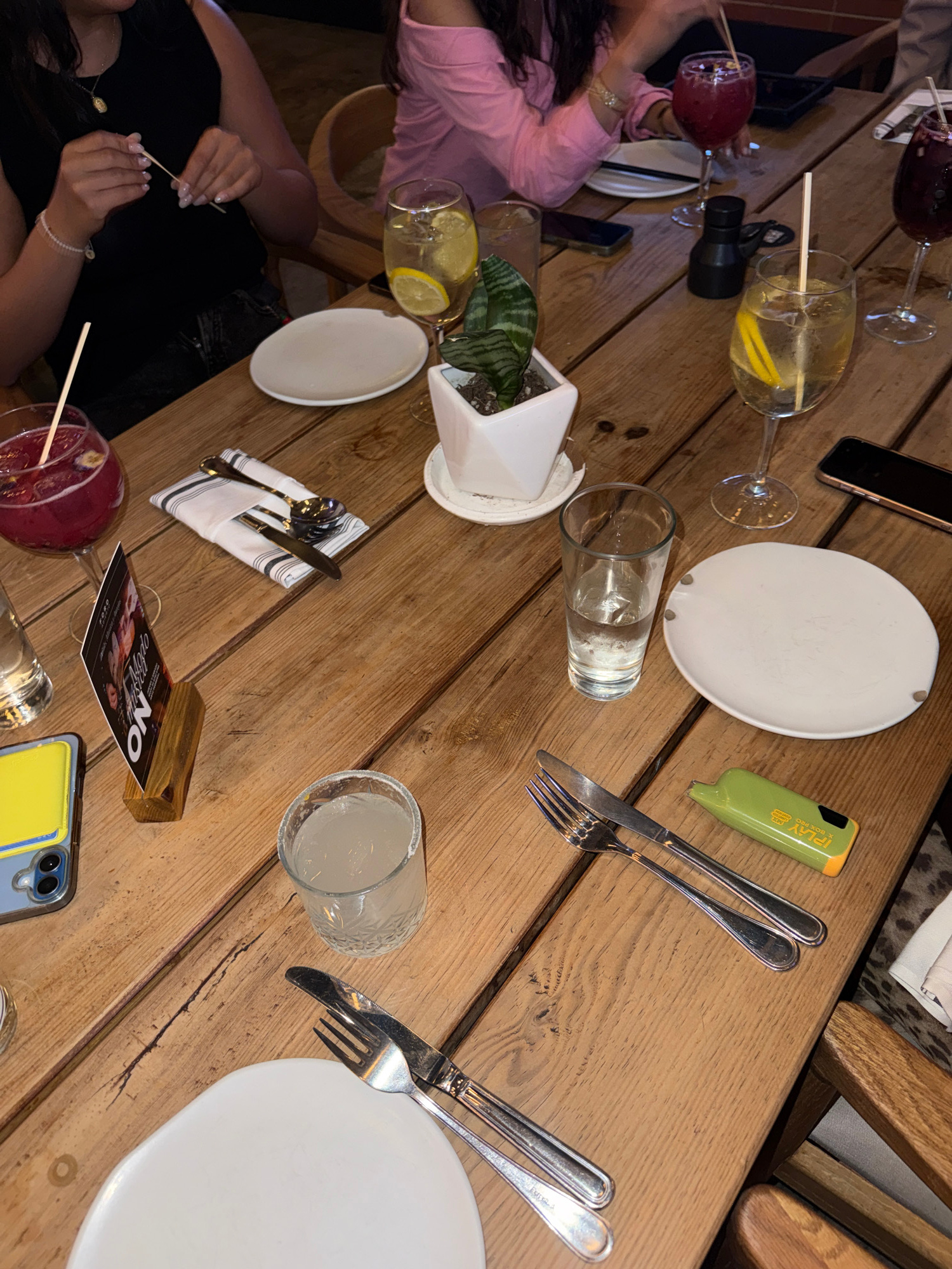 A top-down shot shows a wooden restaurant table, possibly in Mexico City, set with plates, cutlery, glasses of water and cocktails, a small potted plant, phones, and a disposable vape pen. Two individ…read more