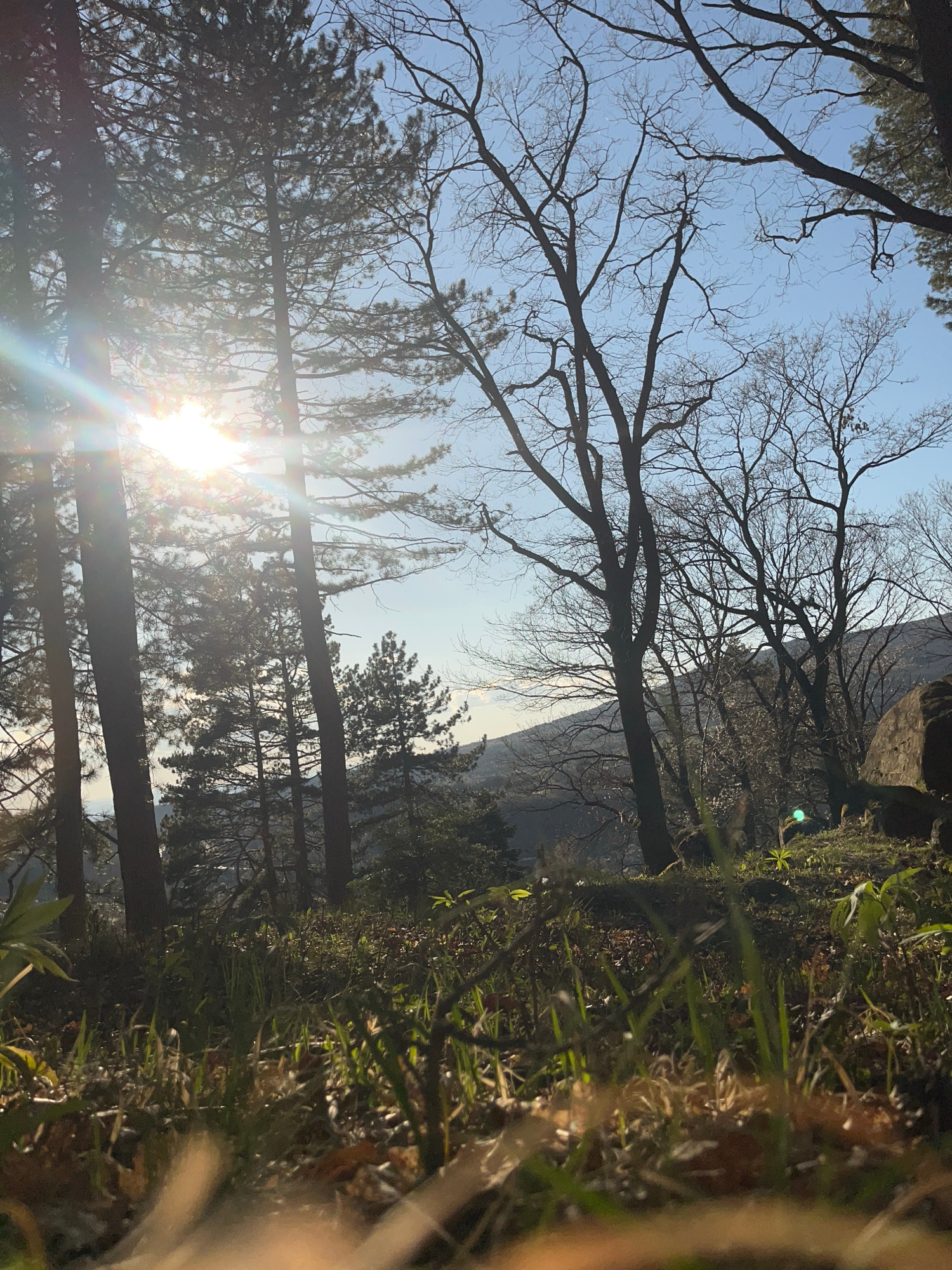 The image shows a forest landscape in Vladaya, Bulgaria, with sunlight filtering through tall trees. The foreground features green foliage and a rocky area, suggesting a hillside or elevated terrain.…read more