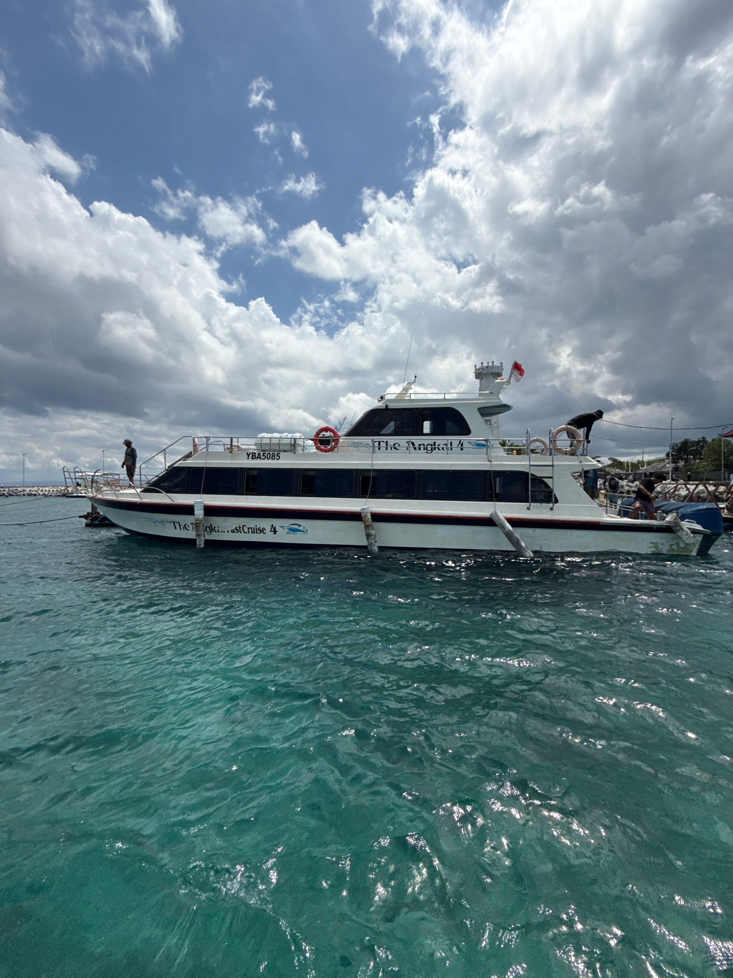 A medium shot captures a boat, labeled "The Angkal..." and "East Cruise 4", docked in the water, with part of a cloudy sky behind it. The water is a mixture of lighter and darker turquoise, with subtl…read more