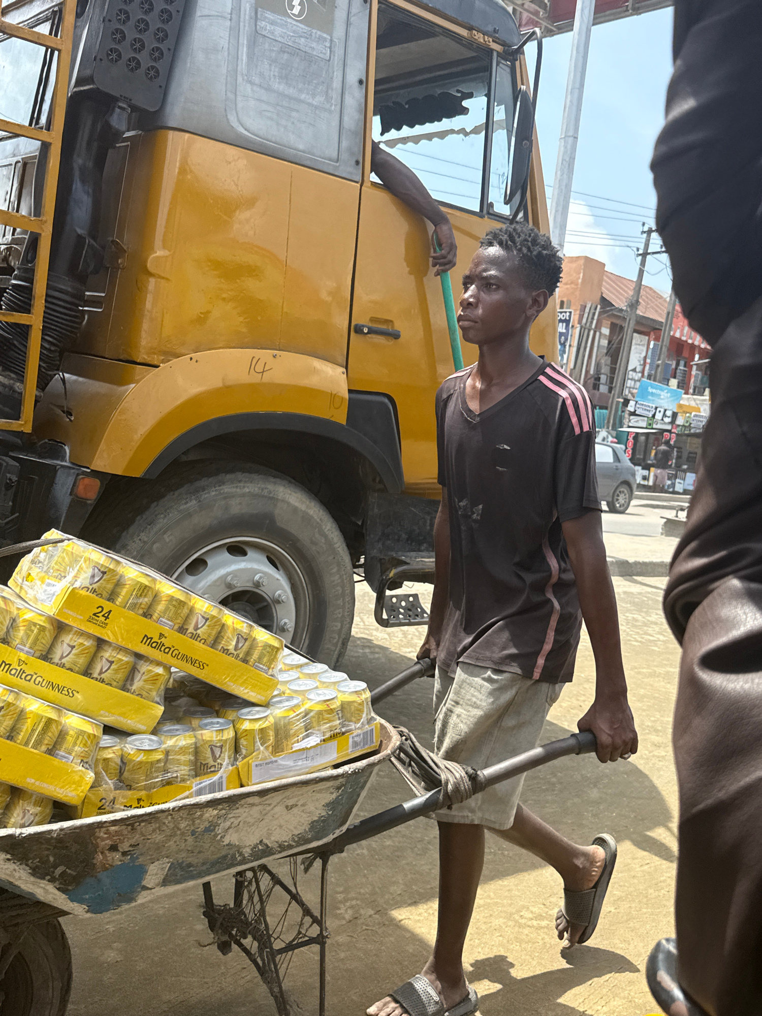 Ado, Nigeria: A man wearing a black shirt with pink stripes, khaki shorts, and slides pulls a cart stacked with cases of "Malta Guinness." The cart is next to the front tire and cab of a yellow commer…read more