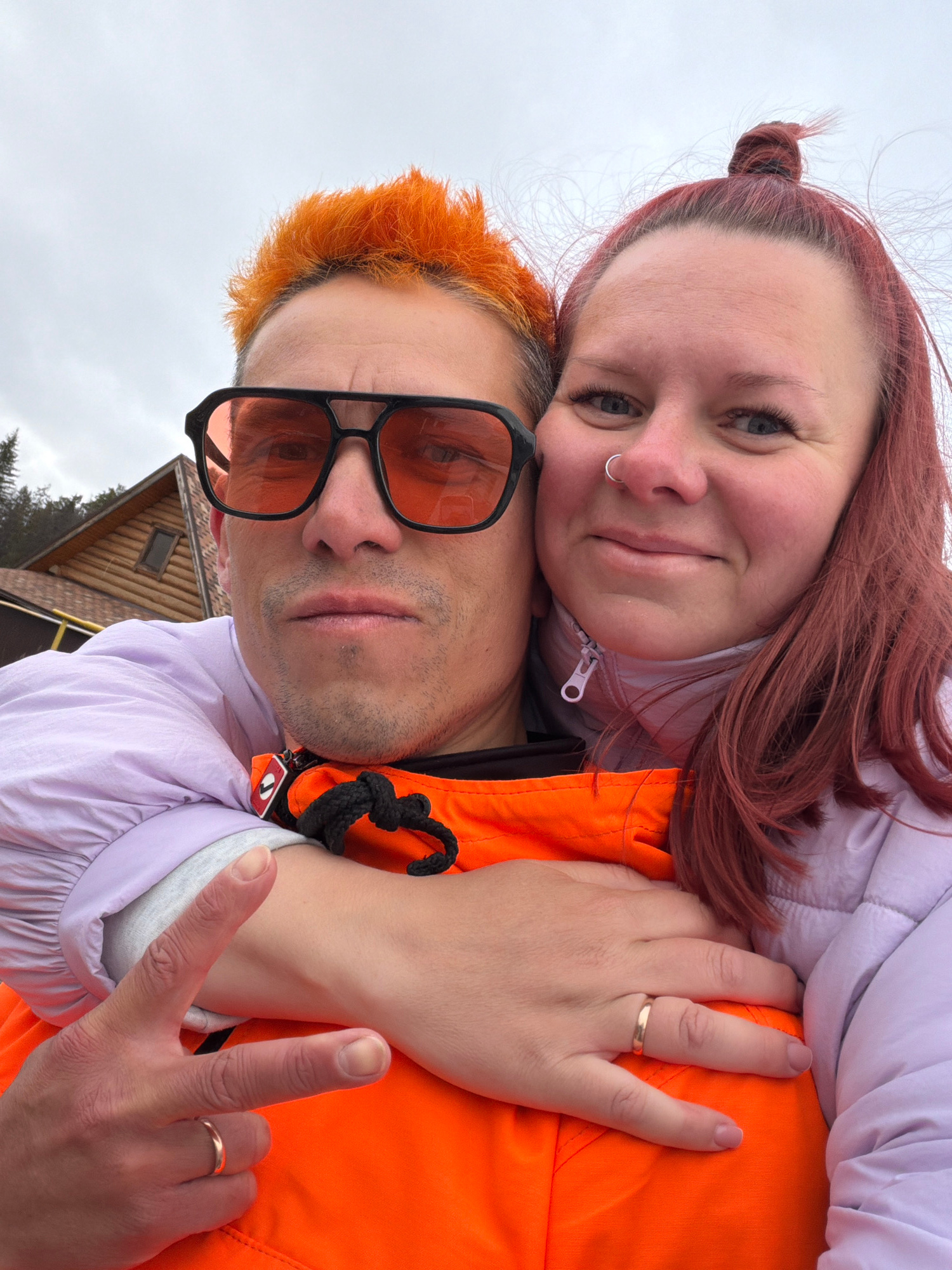 This diagonal close-up shot features two individuals, likely a couple, posing for a selfie in an outdoor setting. The background is dominated by a bright, overcast sky. The woman, positioned at the t…read more