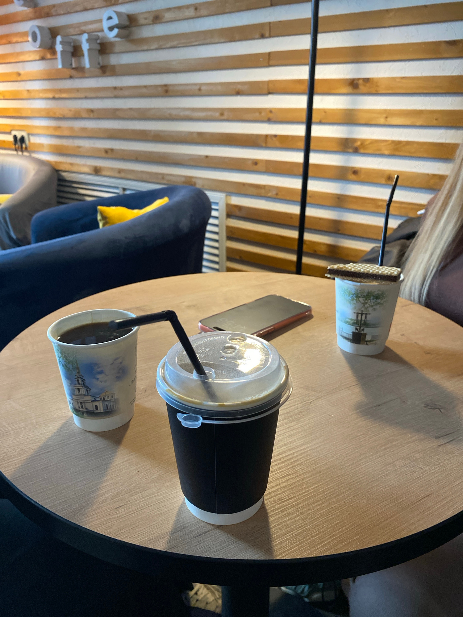 On a light wooden table, two cups of coffee sit next to a phone. One cup has a lid and a black straw, while the other has a straw and a decorative sleeve. The table is located in a cafe, with striped…read more