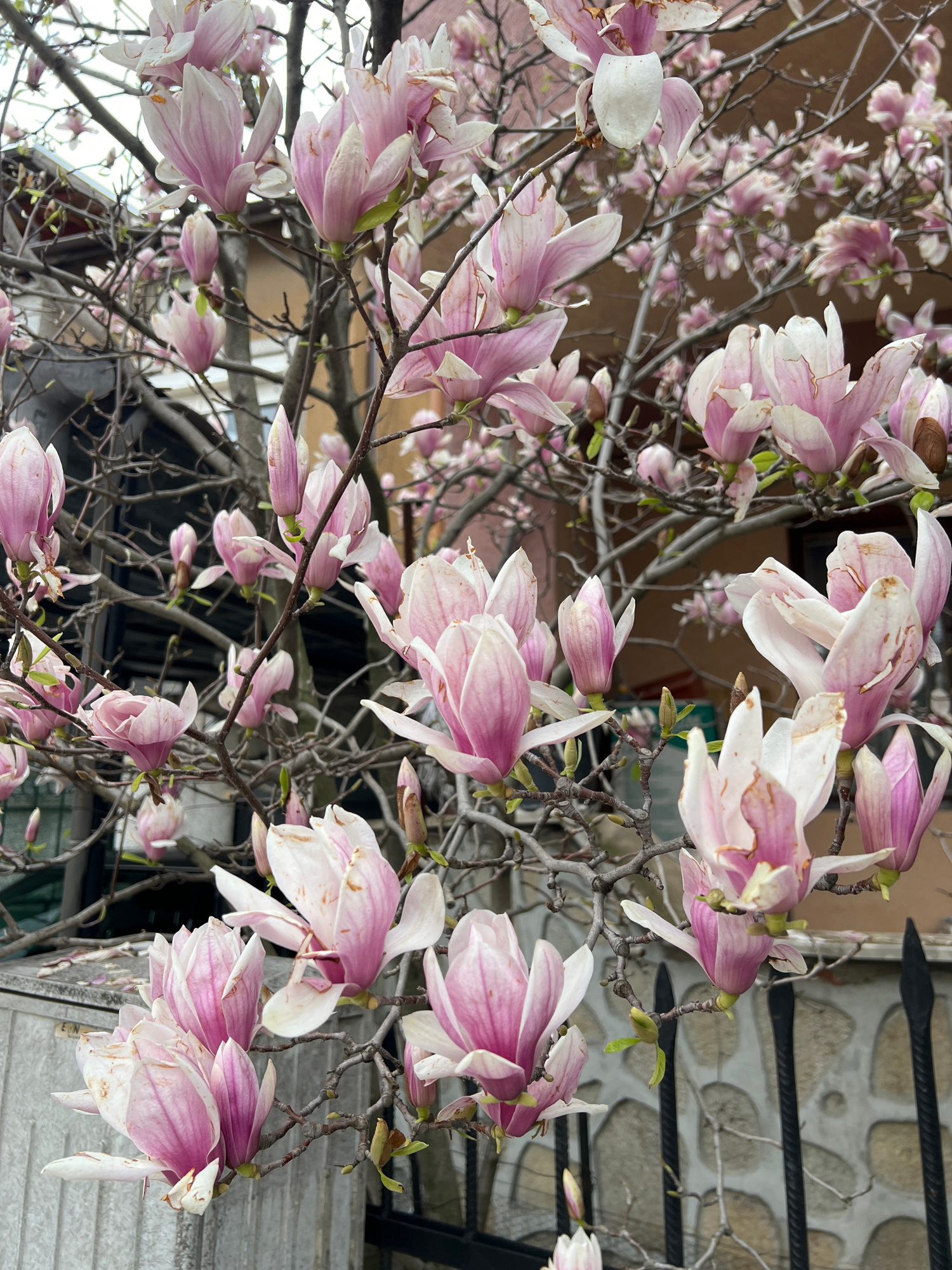 The image shows a close-up view of a blooming magnolia tree with pink and white flowers. The tree branches are bare except for the blossoms. In the background, architectural elements are visible, incl…read more