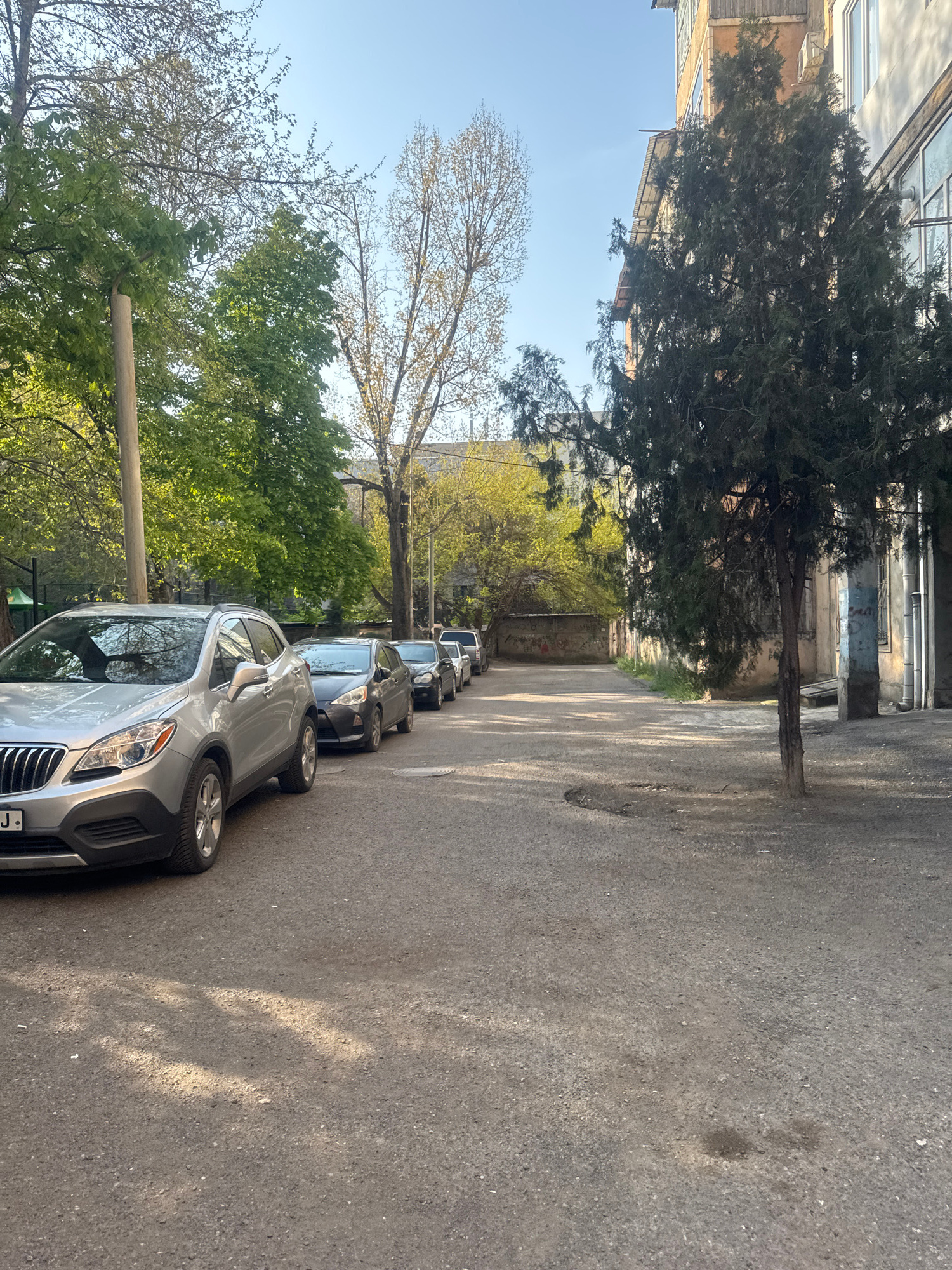 A street view in Tbilisi, Georgia shows a row of parked cars along the right side of a narrow asphalt street. The cars are mostly silver and black, and are parked close together. Trees line the left s…read more