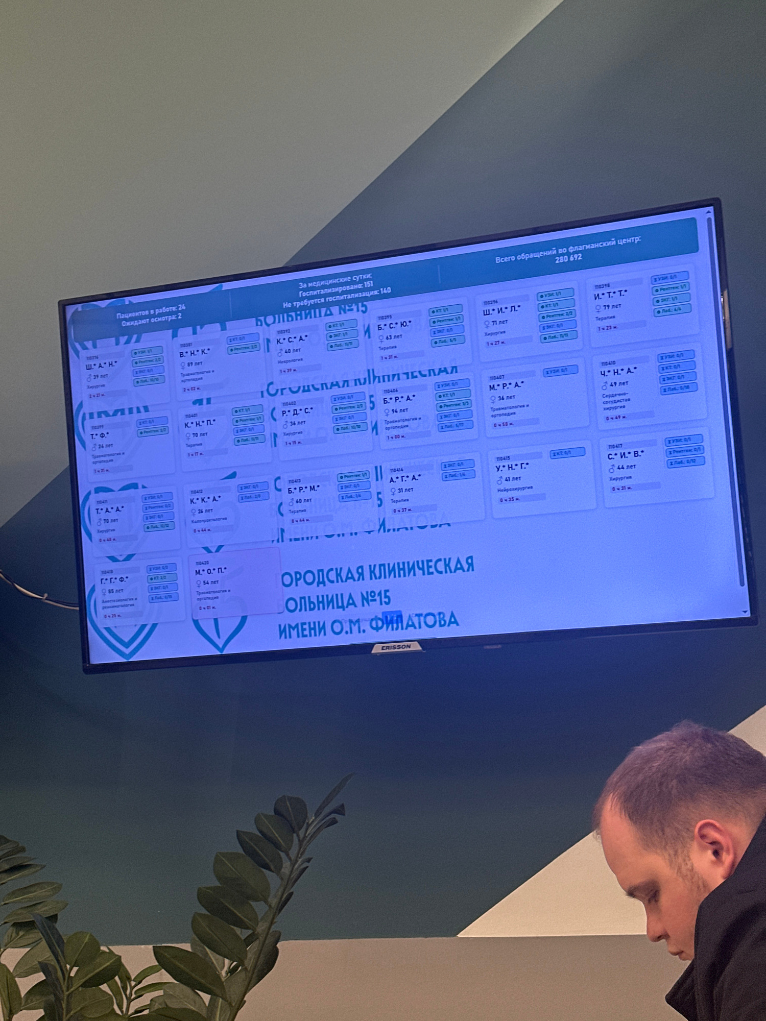 Here is a detailed description of the image: **Scene:** The image shows a screen displaying patient information at what appears to be a medical facility. A person with short, light brown hair is part…read more