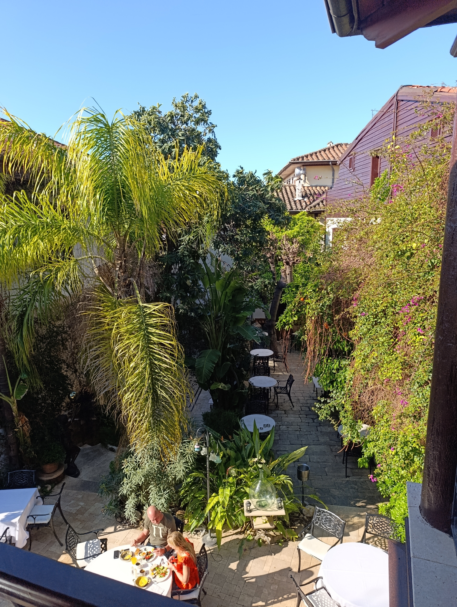 An elevated view of an open-air courtyard in Antalya, Turkey, presents a restaurant setting with trees and vegetation. A cobblestone walkway extends from the bottom center of the frame towards the upp…read more