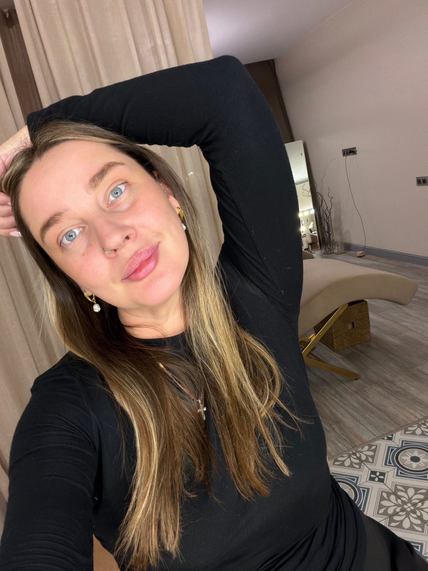 A portrait shot of a woman with long blonde and brown hair, wearing a black long-sleeved shirt. She has fair skin, blue eyes, and is wearing earrings and a nose ring. The background includes a beige c…read more