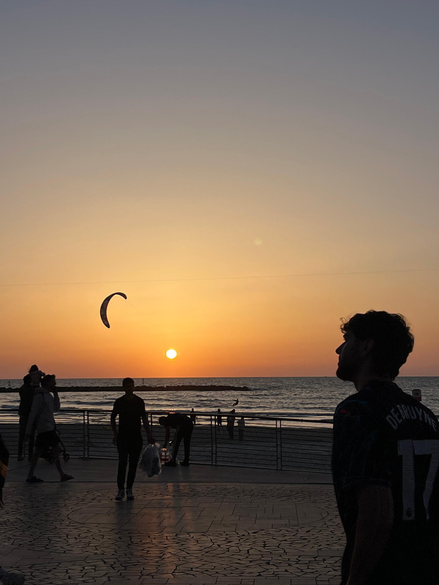 The image depicts a scene along the Tel-Aviv coastline in Israel during sunset. A person is silhouetted in the foreground. People are walking along a walkway adjacent to the beach. A kite is flying in…read more
