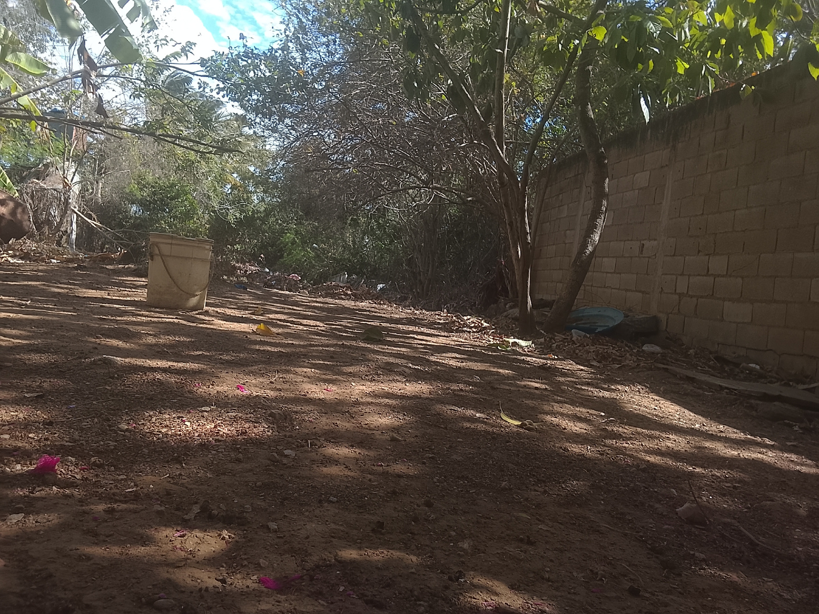 The image depicts an outdoor scene, likely a yard or unpaved area in Altagracia, Venezuela. The ground is dirt and partially shaded. There are scattered leaves, debris, and a few pink flower petals on…read more