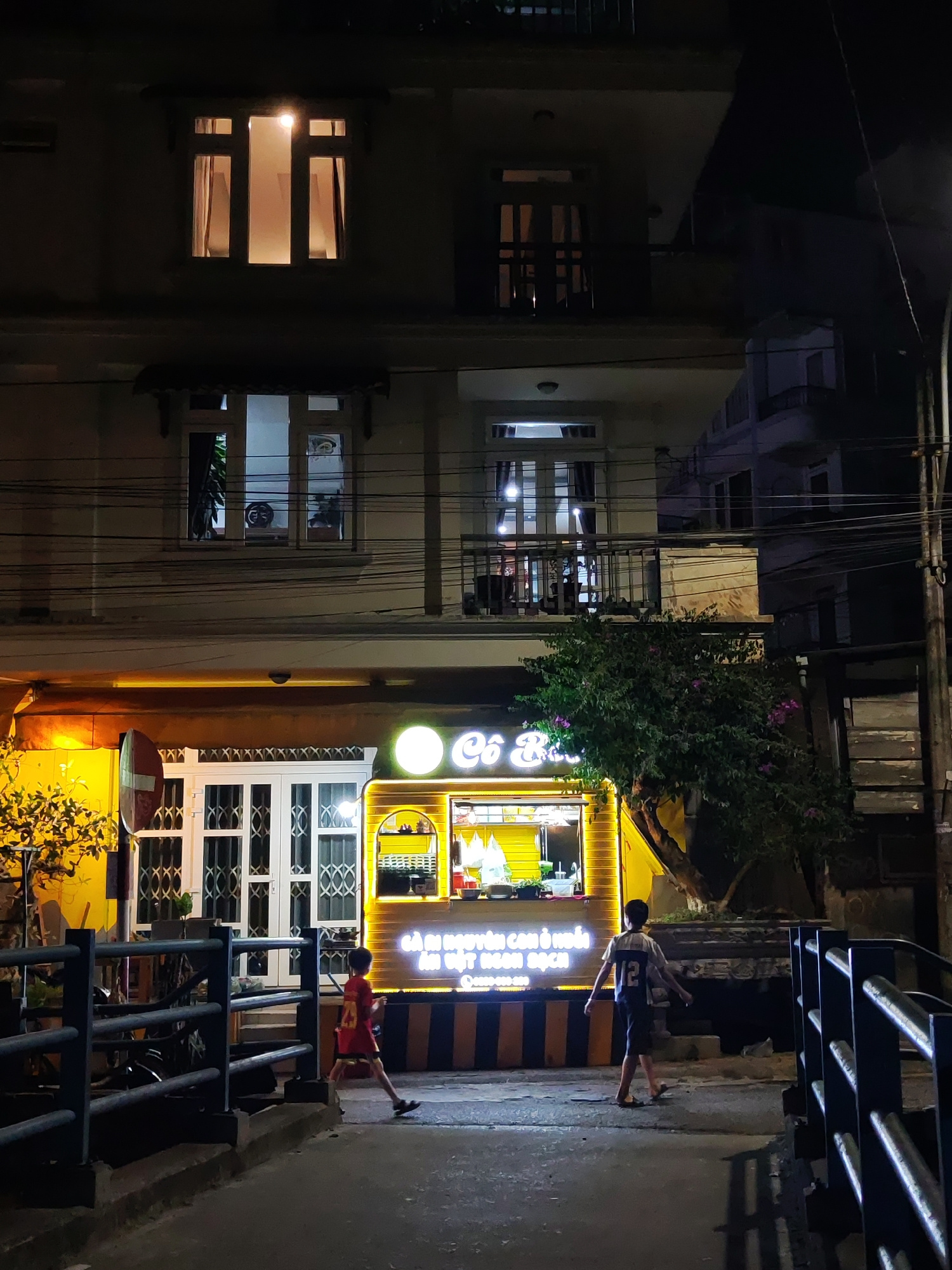 The image depicts a street scene in the city of Cam Ly - Đà Lạt, Vietnam, at night. The background features a three-story building with illuminated windows on each floor. On the ground level, there is…read more