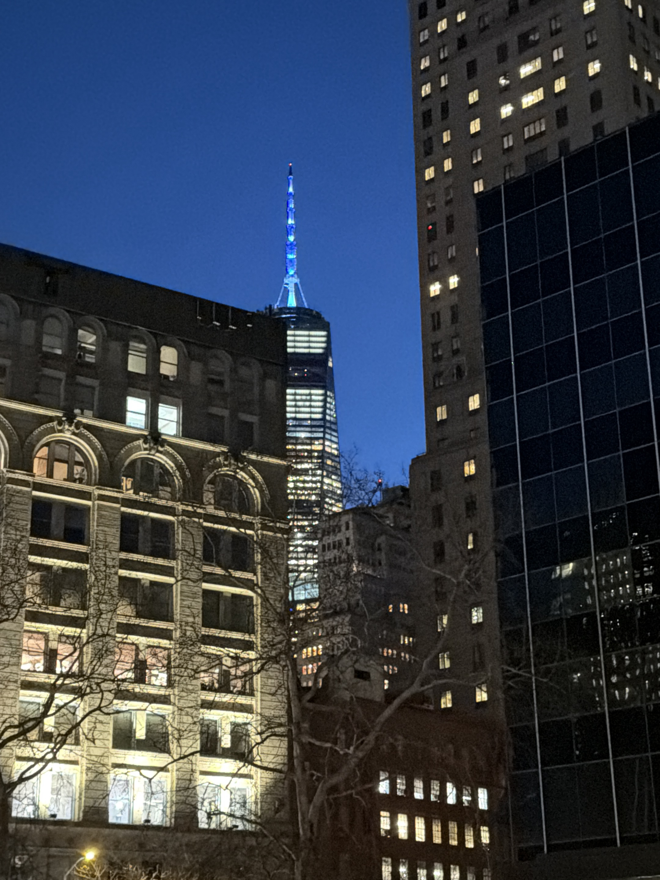 The image captures a nighttime view in New York City, United States. The One World Trade Center (Freedom Tower) is the focal point, brightly illuminated with a blue spire. It is framed by other buildi…read more